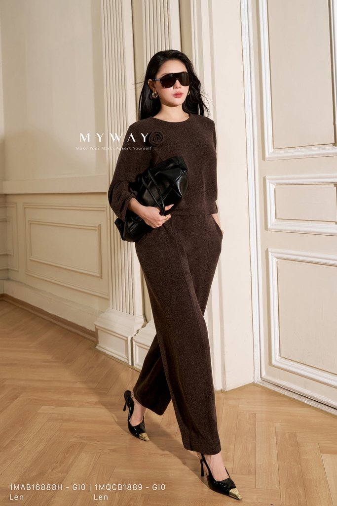 Áo kiểu dáng bo gấu với thiết kế cổ tròn cơ bản, chiều dài ngang hông và tay lỡ mang đến cảm giác gọn gàng, hiện đại, dễ mặc trong nhiều hoàn cảnh, sản phẩm không túi, không lót tạo sự nhẹ nhàng. Áo được thiết kế từ chất liệu len nhập khẩu cao cấp đã qua xử lý, bề mặt mềm mại, giữ phom chuẩn chỉnh giúp tổng thể trang phục luôn chỉn chu. Điểm nhấn nổi bật là chi tiết hoa cài trang trí tinh tế, có thể tháo rời, tạo nét duyên dáng và khác biệt cho thiết kế. Sản phẩm sở hữu gam màu nâu trầm ấm và ghi trang nhã, dễ phối cùng quần hoặc chân váy với nhiều tông màu khác nhau, mang lại sự thoải mái cho người mặc, toát lên vẻ thanh lịch, phong cách hiện đại và khả năng ứng dụng cao.