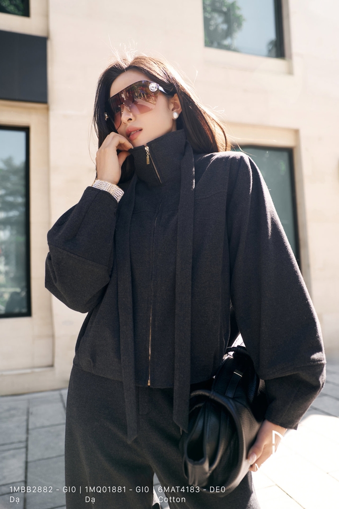 Áo bomber , suông vừa, cổ cách điệu, dài ngang hông, tay dài, khóa trước, có túi và có lót, được thiết kế từ chất liệu dạ nhập khẩu cao cấp đã qua xử lý, giữ phom chuẩn chỉnh và tạo dáng quyến rũ, hiện đại, nổi bật với màu ghi thanh lịch. Điểm nhấn của áo nằm ở chi tiết cổ và tay áo, mang lại sự thoải mái cho thượng khách, toát lên vẻ cá tính, phong cách hiện đại và khả năng phối đồ cao.