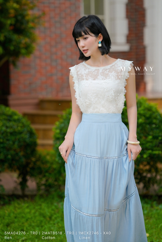 Chân váy xòe 3 tầng mang đến sự bay bổng và nữ tính đầy cuốn hút. Được tạo nên từ chất liệu linen dập vân nhập khẩu cao cấp, chân váy không chỉ giữ phom dáng chuẩn chỉnh mà còn tạo hiệu ứng chất liệu nổi bật. Từng tầng váy được xếp nhún khéo léo, kết hợp chi tiết dây ren trang trí tinh tế, giúp tổng thể vừa mềm mại, vừa độc đáo. Gam xanh da trời nhẹ nhàng góp phần tôn lên vẻ thanh tao, hiện đại, lý tưởng để kết hợp cùng áo sơ mi, áo kiểu hoặc croptop tối giản cho những ngày xuống phố đầy phong cách.