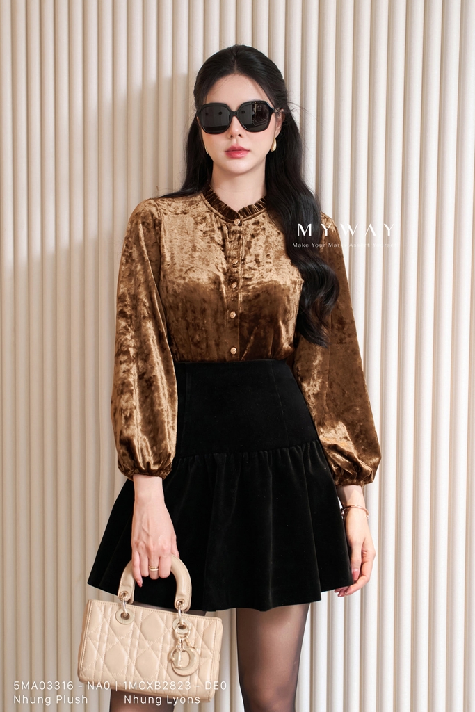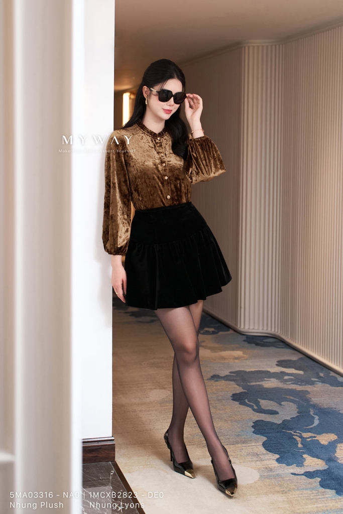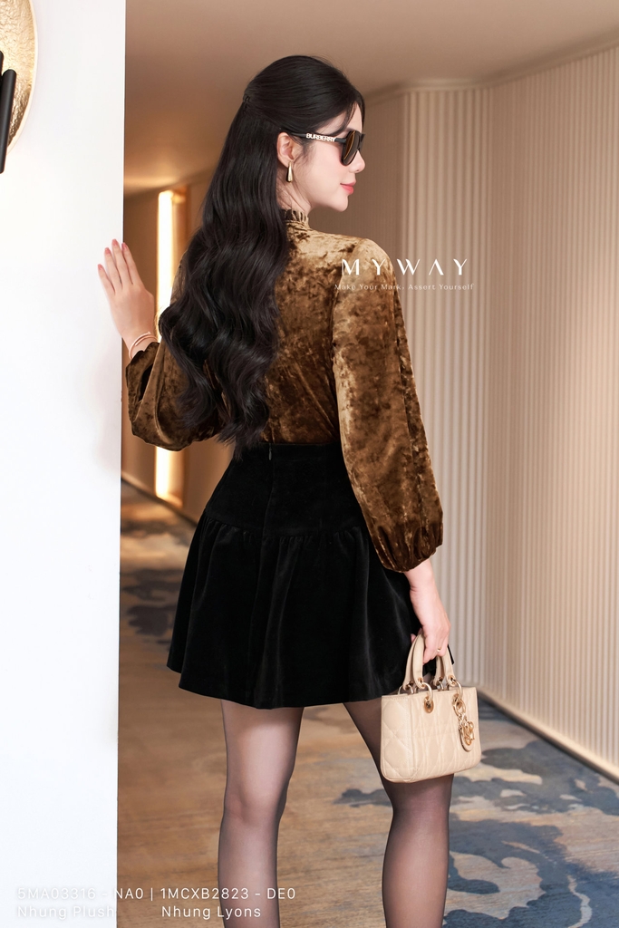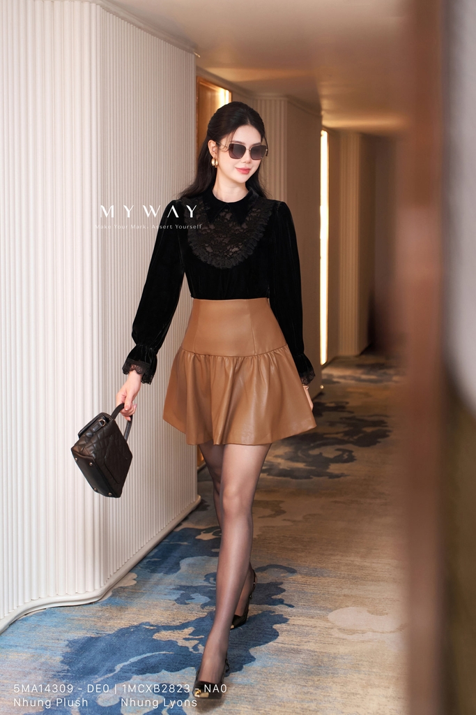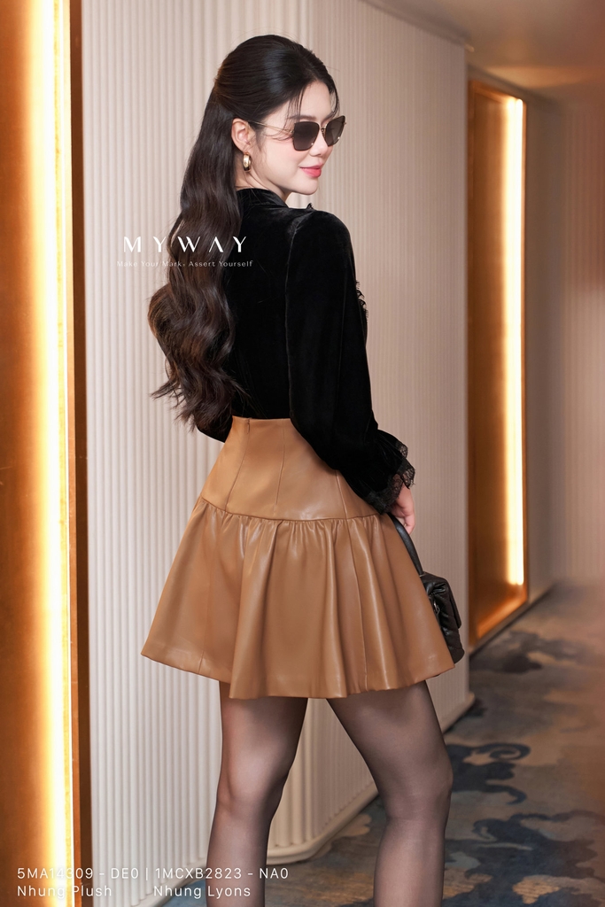 Chân váy xòe dáng A nhẹ, độ dài trên gối, được thiết kế tinh tế với khóa sau tiện lợi, túi ẩn và lớp lót dạng quần đùi giúp người mặc di chuyển thoải mái, tự tin. Sản phẩm mang hai phiên bản chất liệu và màu sắc độc đáo: nâu rêu trên nền da cao cấp và đen trên nền nhung tăm Lyons nhập khẩu. Chất liệu da có độ bóng sang trọng, co giãn nhẹ và giữ phom hoàn hảo, trong khi nhung tăm Lyons mang đến cảm giác mềm mại, thời thượng. Phom dáng A nhẹ nhàng được cách điệu với chi tiết bèo nhún trẻ trung, tạo nên nét nữ tính nhưng vẫn hiện đại. Chân váy mang lại sự thoải mái cho người mặc, tôn lên vẻ thanh lịch và phong cách thời thượng, dễ dàng phối hợp cùng nhiều kiểu áo khác nhau cho nhiều dịp khác nhau.
