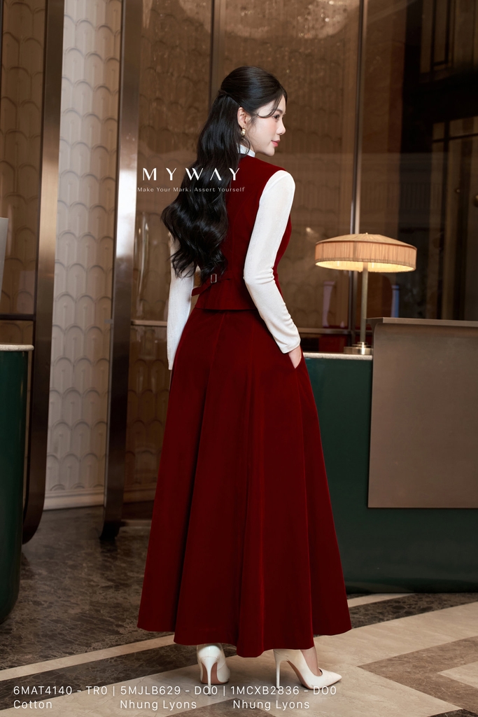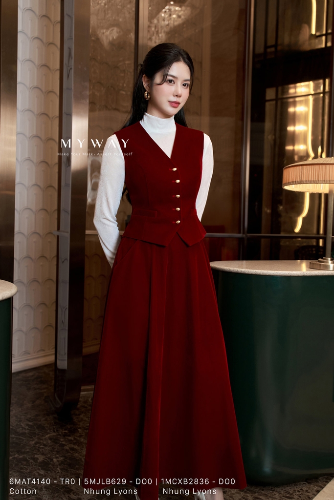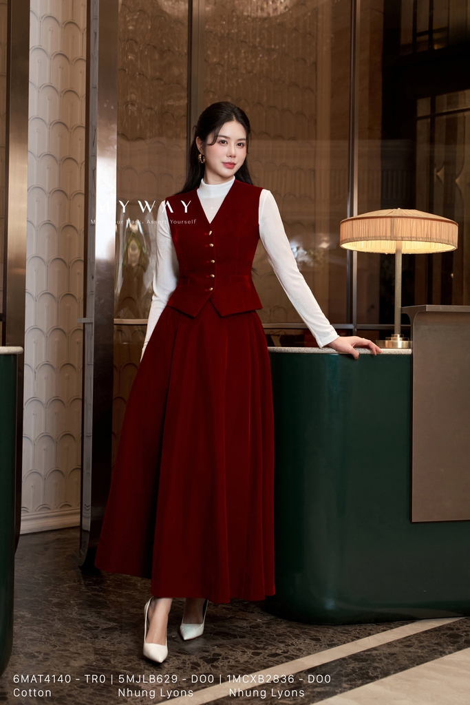 Chân váy xòe rủ dài qua bắp chân, thiết kế tinh tế với phần khóa sau tiện dụng, có túi và lớp lót mềm mại giúp người mặc thoải mái trong mọi chuyển động. Sản phẩm được làm từ chất liệu Nhung Lyons (nhung cứng) nhập khẩu cao cấp, đã qua xử lý để giữ phom chuẩn chỉnh, bề mặt vải mịn sang trọng và thấm hút tốt. Kết cấu bổ mảnh hiện đại tạo nên sự mềm mại, uyển chuyển nhưng vẫn giữ được độ đứng phom cần thiết. Tông màu đỏ thắm nổi bật mang lại vẻ quyến rũ, thanh lịch và dễ dàng phối cùng nhiều kiểu áo khác nhau. Chân váy mang đến phong cách hiện đại, sang trọng, phù hợp cho những dịp đặc biệt hay trang phục công sở tinh tế.
