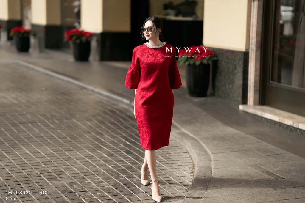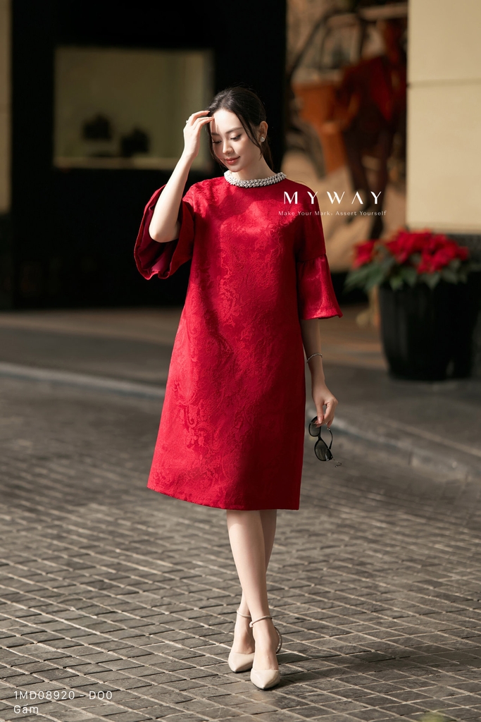 Đầm suông dáng suông vừa với cổ tròn thanh lịch, chiều dài qua gối và tay lỡ mang lại cảm giác trang nhã, hiện đại và dễ mặc trong nhiều hoàn cảnh. Thiết kế khóa sau gọn gàng, có túi tiện lợi cùng lớp lót bên trong giúp tăng sự thoải mái và chỉn chu khi sử dụng. Sản phẩm được nhấn nhá bằng kết cấu hoa lá tinh tế trên nền chất liệu gấm nhập khẩu cao cấp, tạo hiệu ứng bề mặt sang trọng và nổi bật. Gam màu đỏ được thể hiện với sắc độ ấm áp và quyến rũ, vừa tôn da vừa mang đến vẻ nữ tính, thanh lịch nhưng vẫn hiện đại, dễ phối cùng giày và phụ kiện để hoàn thiện nhiều phong cách khác nhau.