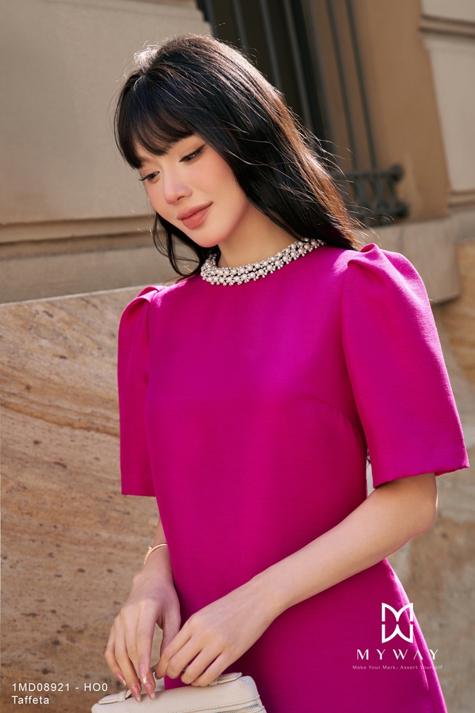 Đầm suông dáng suông vừa với thiết kế cổ tròn, chiều dài ngang bắp và tay ngắn mang đến cảm giác nhẹ nhàng, thanh thoát, sản phẩm có khóa sau, túi tiện lợi và lớp lót giúp người mặc thoải mái, đứng dáng hơn, được chế tác từ chất liệu Taffeta nhập khẩu cao cấp đã qua xử lý nên bề mặt vải có độ đứng nhẹ, bắt sáng tinh tế và giữ phom chuẩn chỉnh, điểm nhấn nổi bật nằm ở chi tiết dây đính cườm và hạt trai trang trí quanh cổ áo tạo nét sang trọng, duyên dáng, tông màu hồng mềm mại, nữ tính với sắc độ tươi tắn nhưng không quá rực, dễ tôn da và mang lại cảm giác trẻ trung, trang nhã, tổng thể thiết kế giúp người mặc toát lên vẻ dịu dàng, phong cách hiện đại và có khả năng phối đồ linh hoạt cho nhiều dịp khác nhau.