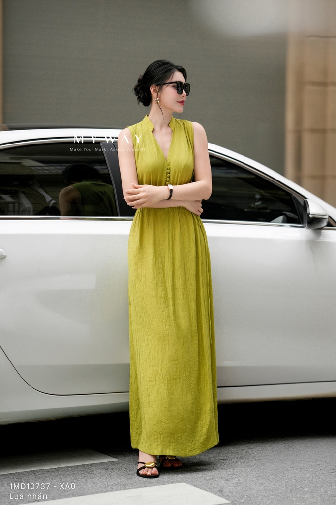 Đầm suông dáng nhẹ nhàng, cổ tàu thanh thoát, chiều dài qua bắp mang lại sự kín đáo mà vẫn duyên dáng. Gam xanh nõn chuối tươi mát tạo điểm nhấn độc đáo, vừa trẻ trung vừa sang trọng, giúp người mặc nổi bật một cách tinh tế.Sản phẩm được chế tác từ chất liệu lụa nhăn nhập khẩu cao cấp, bề mặt vải có kết cấu tự nhiên, mềm mại và sang trọng. Chất liệu này không chỉ giữ phom chuẩn chỉnh mà còn mang lại cảm giác thoải mái, thoáng nhẹ trong suốt ngày dài.Điểm nhấn của thiết kế nằm ở sự kết hợp hài hòa giữa phom dáng suông hiện đại, chất liệu cao cấp và kết cấu vải đặc biệt, mang đến vẻ đẹp thanh lịch, tự nhiên mà không kém phần phong cách.