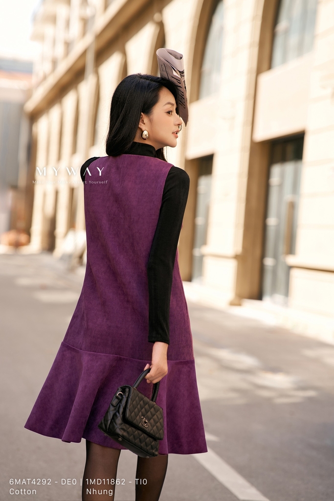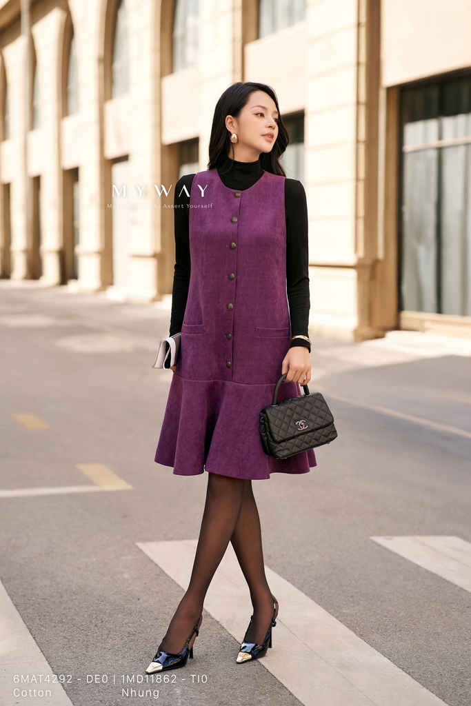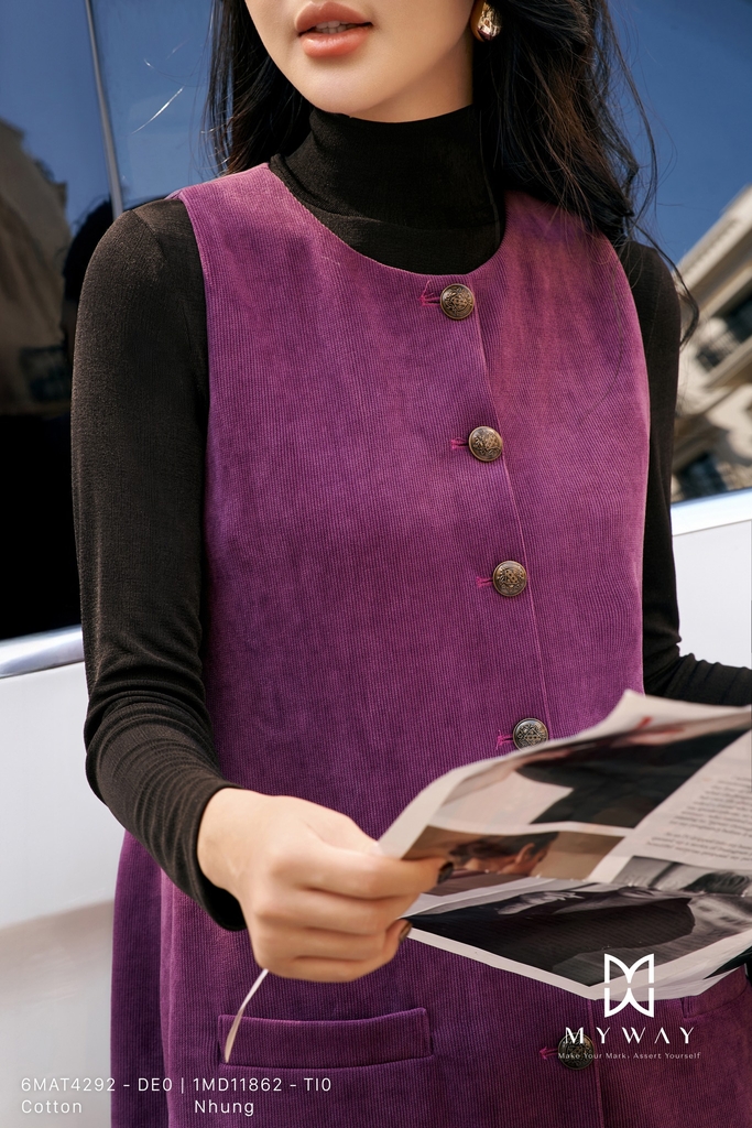 Đầm suông dáng suông vừa, cổ tròn, dài qua gối, không tay, có túi và có lót, được thiết kế từ chất liệu nhung tím nhập khẩu cao cấp đã qua xử lý giúp tạo form dáng quyến rũ và hiện đại. Chất liệu nhung mềm mịn lên phom chuẩn chỉnh, mang đến cảm giác sang trọng và êm ái khi mặc, đồng thời màu tím trầm quý phái làm nổi bật vẻ tinh tế của trang phục. Điểm nhấn nằm ở chi tiết khuy trang trí tinh tế tạo điểm hút mắt nhẹ nhàng. Trang phục mang lại sự thoải mái cho thượng khách, toát lên vẻ thanh lịch, phong cách hiện đại và dễ dàng phối hợp trong nhiều hoàn cảnh.