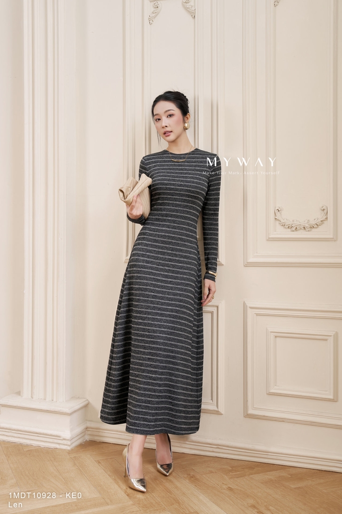 Đầm xòe dáng ôm vừa với cổ tròn, chiều dài qua bắp, tay dài và khóa kéo phía sau, không túi, không lót, được thiết kế tinh tế với họa tiết vải kẻ ngang trên nền đen kẻ ghi, trong đó gam đen chủ đạo mang lại cảm giác sang trọng và thon gọn, kết hợp cùng những đường kẻ ghi sáng tạo chiều sâu và điểm nhấn hiện đại cho tổng thể, giúp trang phục vừa nổi bật vừa dễ mặc trong nhiều hoàn cảnh; sản phẩm được làm từ chất liệu len nhập khẩu cao cấp đã qua xử lý, lên phom chuẩn chỉnh, mềm mại nhưng vẫn giữ được cấu trúc dáng váy, điểm nhấn nằm ở phom dáng cân đối kết hợp cùng chất liệu vải cao cấp, mang lại sự thoải mái cho người mặc, đồng thời toát lên vẻ thanh lịch, phong cách hiện đại và khả năng phối đồ cao.