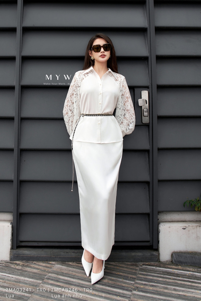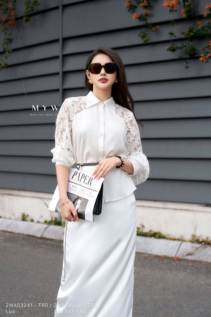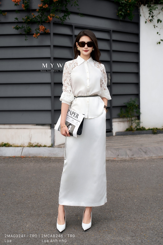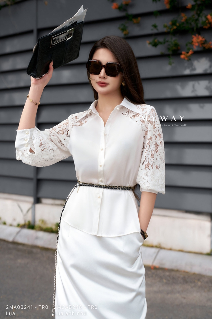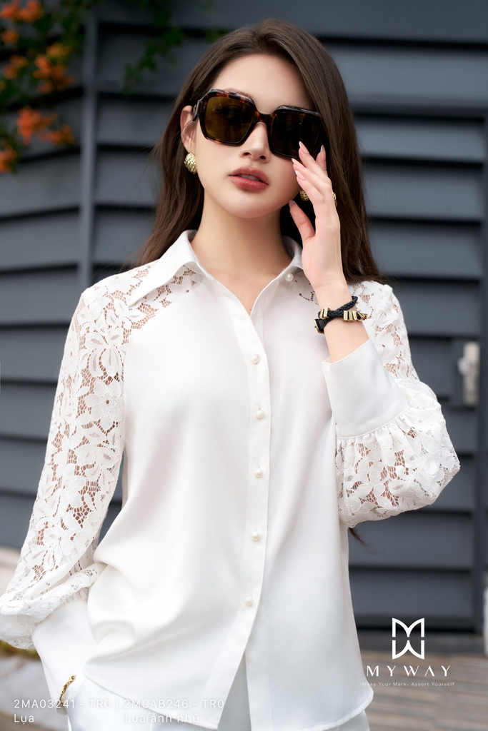 Áo sơ mi dáng suông vừa với cổ Đức thanh lịch, chiều dài ngang mông, tay dài, thiết kế không túi và không lót mang đến cảm giác nhẹ nhàng, thoáng mát khi mặc; sản phẩm sử dụng gam màu trắng tinh khôi, sắc độ trang nhã giúp tôn da và dễ dàng phối cùng nhiều trang phục khác nhau từ chân váy, quần âu đến denim, phù hợp cả môi trường công sở lẫn những dịp gặp gỡ trang trọng; áo được thiết kế từ chất liệu lụa nhập khẩu cao cấp đã qua xử lý, bề mặt mềm mịn, có độ rủ tự nhiên nhưng vẫn giữ phom chuẩn chỉnh, tạo nên vẻ ngoài quyến rũ và hiện đại; điểm nhấn nằm ở kết cấu áo tinh tế cùng chi tiết tay phối ren mới lạ, tăng thêm nét nữ tính và sang trọng cho tổng thể; lưu ý bảo quản tránh phụ liệu, phụ kiện đính kèm bị phai màu, bong tróc hoặc làm xước mặt vải, hạn chế phơi trực tiếp dưới ánh nắng và tránh cào cấu hay tiếp xúc với phụ kiện kim loại vì chất vải dễ móc; sản phẩm mang lại sự thoải mái cho người mặc, toát lên vẻ thanh lịch, phong cách hiện đại và khả năng phối đồ cao.