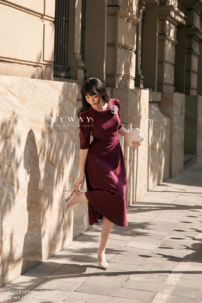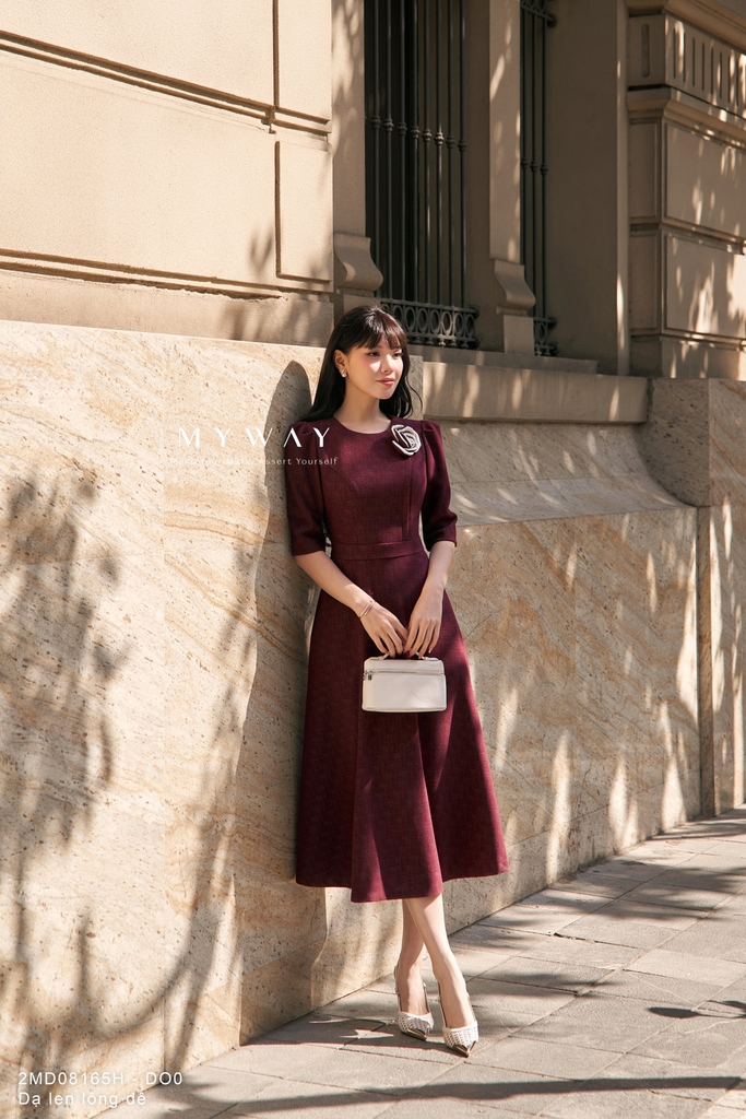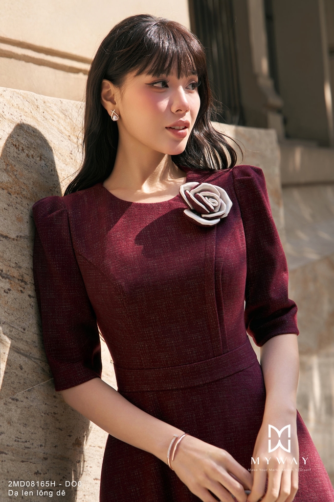 Đầm xòe với thiết kế trên ôm dưới xòe nhẹ, cổ tròn, chiều dài qua bắp và tay lỡ tạo cảm giác thanh lịch, cân đối vóc dáng, sản phẩm có túi tiện lợi, lớp lót giúp mặc thoải mái và giữ phom đẹp, được thiết kế từ chất liệu dạ lông dê nhập khẩu cao cấp đã qua xử lý nên bề mặt vải mềm mại, ấm áp, có độ xước nhẹ tinh tế và đứng dáng hiện đại, điểm nhấn nổi bật nằm ở hoa cài 3D đi kèm kết hợp hài hòa với phom dáng xòe duyên dáng, sắc đỏ vang sang trọng với tông màu trầm ấm, sâu và quyến rũ, dễ tôn da, mang lại cảm giác chín chắn nhưng vẫn nữ tính, tổng thể thiết kế giúp người mặc toát lên vẻ thanh lịch, phong cách hiện đại và có khả năng phối đồ cao trong nhiều hoàn cảnh.
