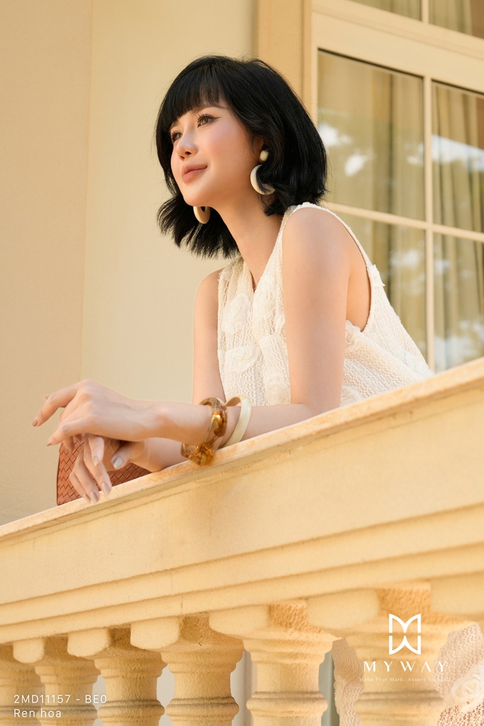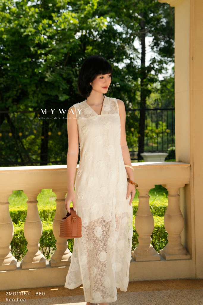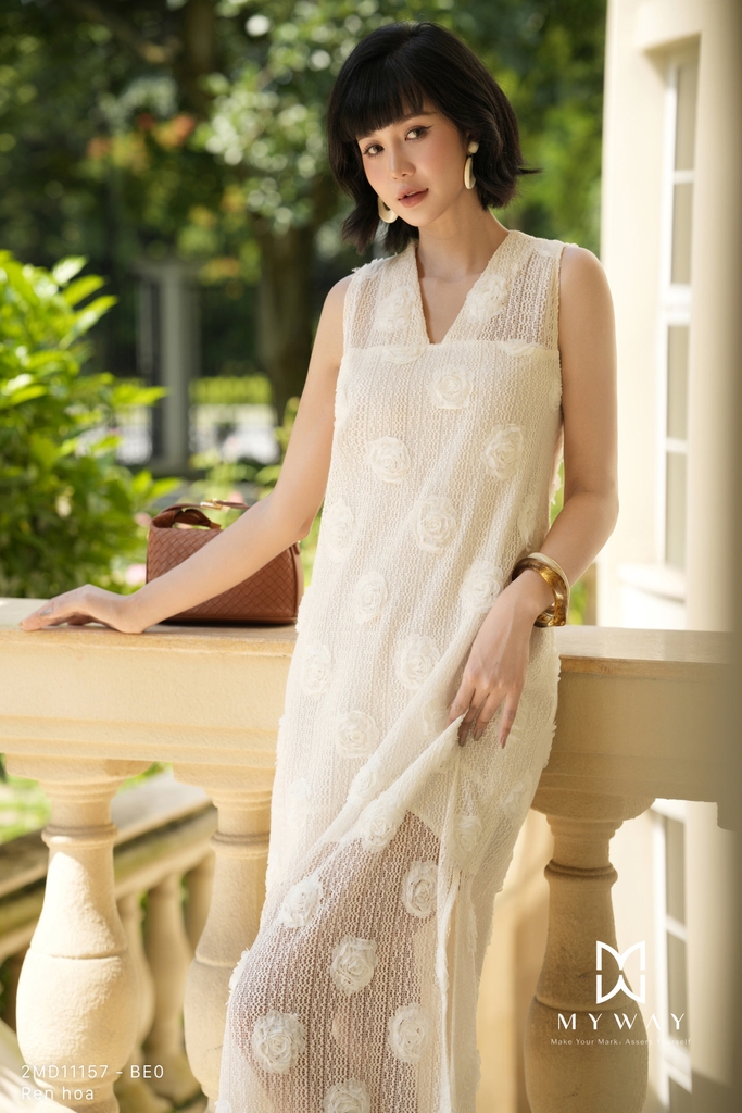 Đầm suông với phom dáng vừa vặn, cổ biến kiểu và chiều dài qua bắp tạo nên vẻ ngoài thanh lịch, nữ tính. Thiết kế nổi bật với chất liệu ren hoa 3D màu beige nhập khẩu, xử lý kỹ lưỡng để giữ phom dáng chuẩn và mang lại cảm giác nhẹ nhàng, thoáng mát. Họa tiết hoa nổi tinh xảo chính là điểm nhấn đầy cuốn hút, giúp người mặc toát lên phong cách hiện đại mà vẫn mềm mại, duyên dáng.