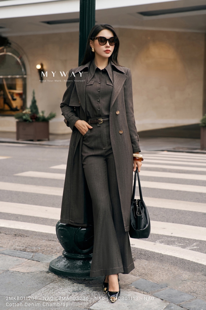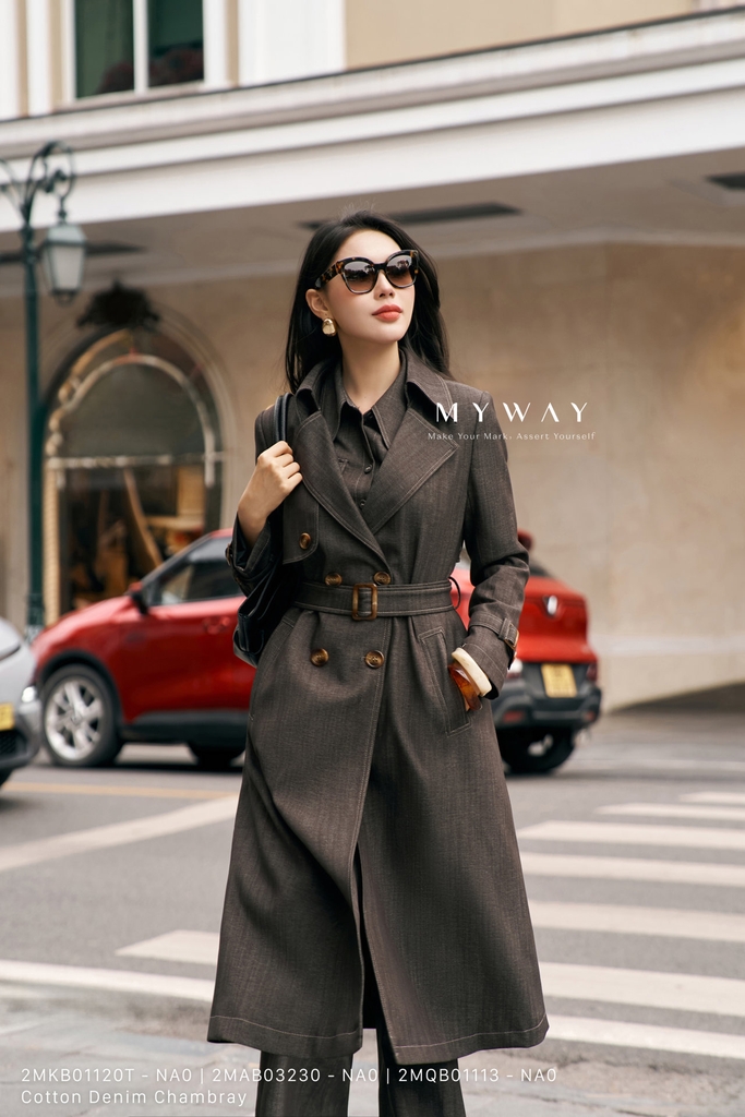Áo khoác suông, cổ 2 ve biến kiểu, dài ngang bắp, tay dài với đệm vai/ken vai, có túi và có lót, được thiết kế từ chất liệu Cotton Denim Chambray (vải bò jean) nhập khẩu cao cấp đã qua xử lý, tạo form dáng quyến rũ, hiện đại, mang lại cảm giác thoải mái cho người mặc. Chất liệu nhập khẩu cao cấp giúp áo giữ phom chuẩn chỉnh, bền đẹp, điểm nhấn nằm ở kết cấu tinh tế và phom dáng thanh lịch, đồng thời áo đi kèm thắt lưng giúp tạo nét cá tính và sang trọng. Màu nâu trầm ấm dễ phối đồ, toát lên phong cách hiện đại, thanh lịch và khả năng phối hợp linh hoạt với nhiều trang phục.