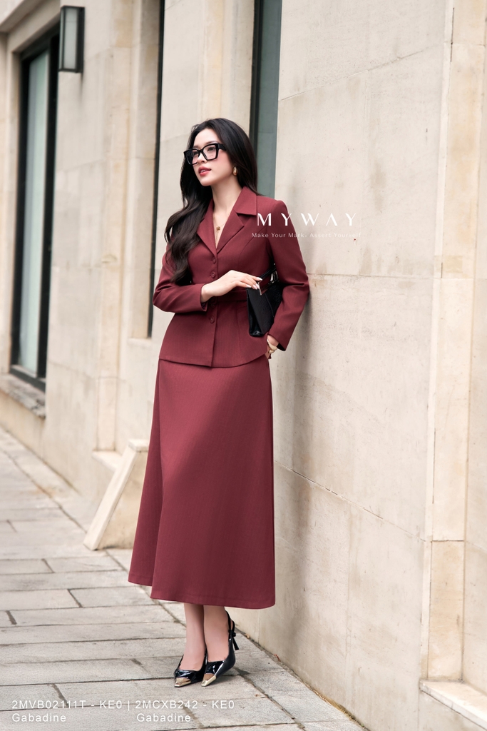 Áo vest dáng ôm vừa, cổ hai ve thanh lịch được biến kiểu lạ mắt, thiết kế dài ngang mông, tay dài có đệm vai/ken vai giúp phom áo đứng dáng và tôn nét hiện đại, có túi tiện lợi, có lót và đính kèm thắt lưng giúp hoàn thiện tổng thể trang phục. Sản phẩm được may từ chất liệu Gabadine nhập khẩu cao cấp đã qua xử lý, giữ phom chuẩn chỉnh và mang lại vẻ ngoài quyến rũ, hiện đại. Điểm nhấn của áo nằm ở phần cổ áo biến kiểu độc đáo kết hợp cùng phom dáng gọn gàng và chất liệu vải cao cấp, tạo nên phong cách thanh lịch, hiện đại và khả năng phối đồ cao. Họa tiết kẻ dọc màu đỏ gạch trầm ấm, sang trọng, giúp tổng thể thêm nổi bật nhưng vẫn tinh tế.
