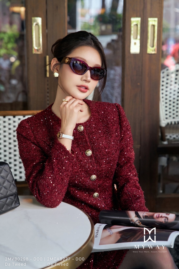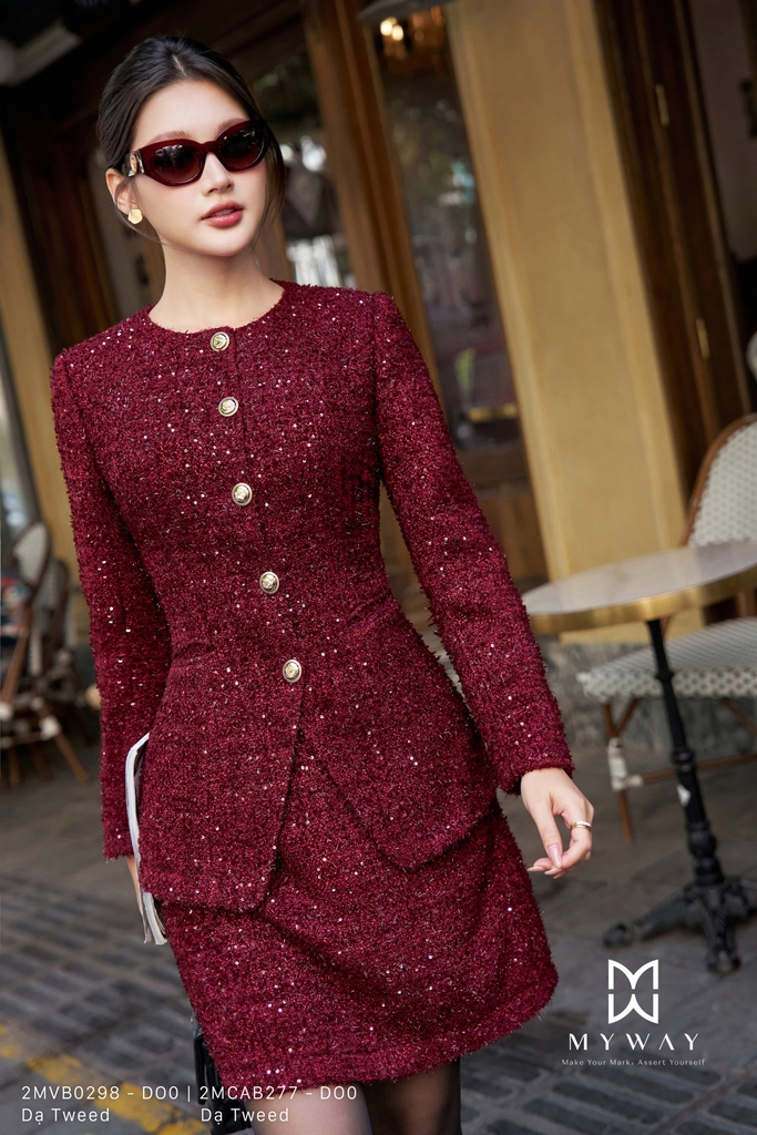 Áo vest ôm vừa cổ tròn dáng dài chùm mông được chế tác từ chất liệu Dạ Tweed dệt kim sa nhập khẩu cao cấp, mang vẻ đẹp sang trọng và đẳng cấp. Bề mặt vải ánh kim sa đỏ vang lấp lánh tinh tế, tạo hiệu ứng thị giác cuốn hút mà không phô trương. Thiết kế được xử lý tỉ mỉ, giữ phom chuẩn chỉnh, tôn dáng người mặc. Điểm nhấn là hàng khuy trang trí nổi bật trên nền chất liệu cao cấp, mang lại vẻ thời thượng và quý phái. Một thiết kế vừa hiện đại vừa thanh lịch, giúp quý cô dễ dàng tỏa sáng trong mọi khoảnh khắc.