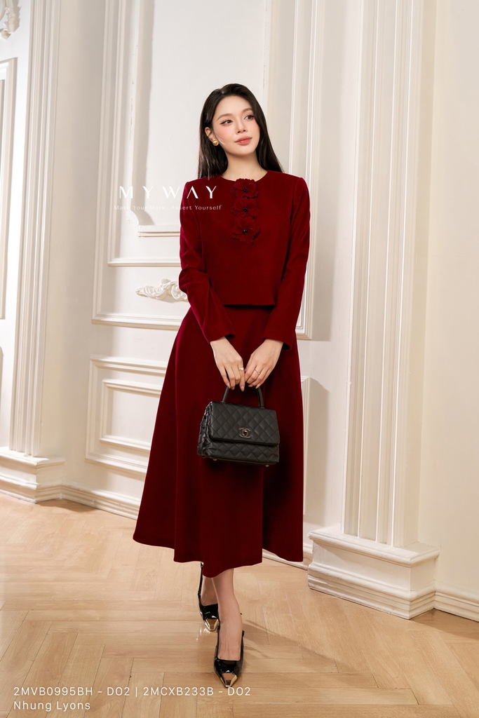 Áo vest được thiết kế dáng suông vừa dễ mặc, cổ tròn thanh lịch, chiều dài ngang hông cùng tay dài tạo tổng thể gọn gàng và hiện đại, có lót giúp mặc thoải mái nhưng không có túi để giữ phom dáng tinh tế. Áo sử dụng chất liệu nhung Lyons (nhung cứng) nhập khẩu cao cấp đã qua xử lý, cho bề mặt mịn sang trọng, độ đứng phom tốt và giữ dáng chuẩn chỉnh. Điểm nhấn nổi bật là hoa cài 3D tinh xảo kết hợp với phom suông vừa giúp che khuyết điểm cơ thể hiệu quả. Gam màu đỏ chủ đạo mang sắc đỏ trầm sang trọng, ánh nhung bắt sáng nhẹ tạo chiều sâu màu sắc, giúp tổng thể trang phục trở nên nổi bật nhưng vẫn giữ được nét thanh lịch, hiện đại, dễ phối cùng nhiều kiểu trang phục và phụ kiện khác nhau.