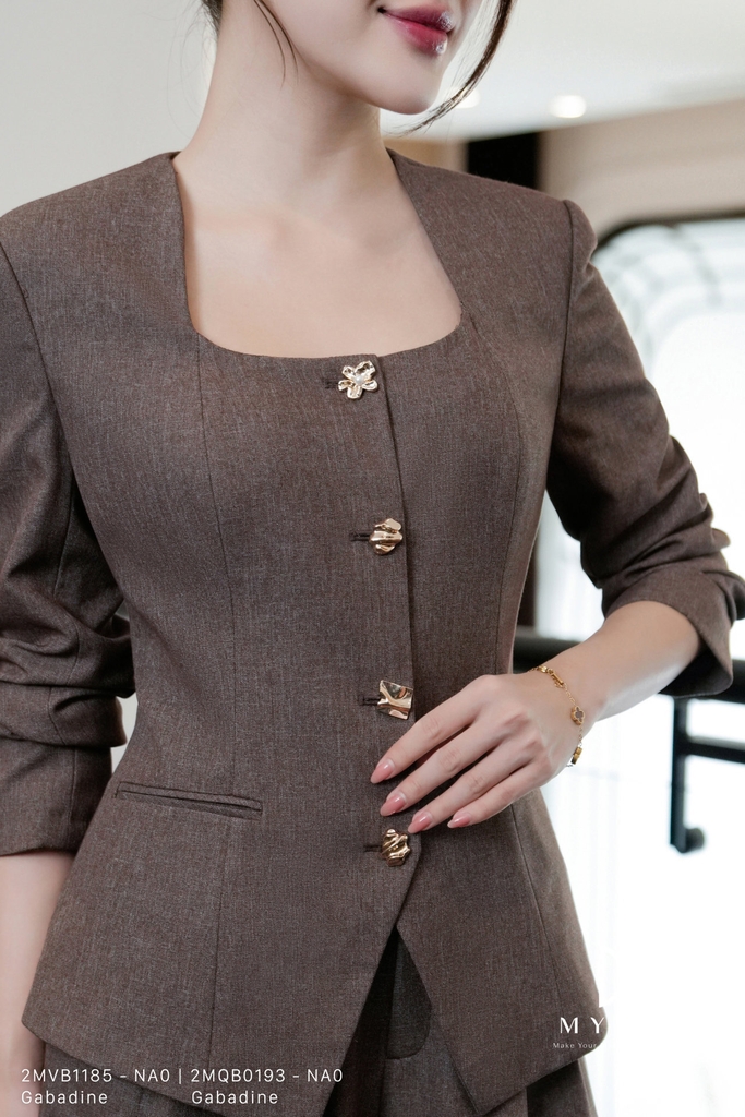 Áo kiểu dáng suông vừa, cổ tròn, dài ngang hông, tay dài kết hợp chi tiết đệm vai tạo nên vẻ ngoài thanh thoát và hiện đại. Thiết kế được nhấn nhá bằng hàng khuy trang trí độc đáo trên nền họa tiết kẻ dọc màu nâu sang trọng, giúp tôn lên nét tinh tế và tạo điểm nhấn thị giác đầy cuốn hút. Sản phẩm được may từ chất liệu Gabadine nhập khẩu cao cấp, đã qua xử lý để giữ phom chuẩn chỉnh và tạo độ rủ mềm mại, mang đến sự thoải mái khi mặc. Với gam màu nâu kẻ dọc cổ điển nhưng hiện đại, áo không chỉ dễ dàng phối hợp cùng nhiều trang phục mà còn khéo léo che đi khuyết điểm cơ thể, tôn vinh phong thái thanh lịch và đẳng cấp cho người mặc.