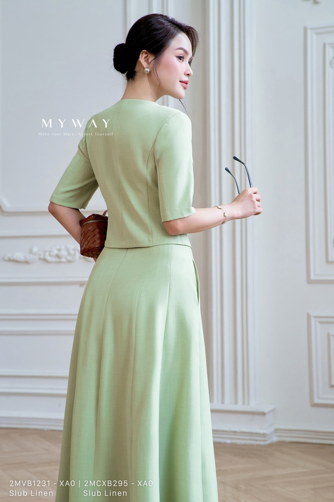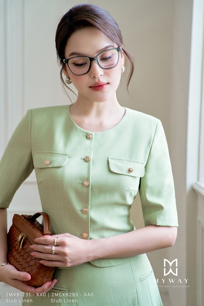 Áo kiểu dáng ôm vừa, chiều dài ngang hông cùng tay lỡ duyên dáng, được nhấn nhá tinh tế với khuy kim loại trang trí hiện đại. Thiết kế từ chất liệu Slub Linen (xước nhật, đũi xước) nhập khẩu cao cấp đã qua xử lý kỹ lưỡng, mang đến form dáng chuẩn chỉnh, bề mặt vải tự nhiên, thoáng nhẹ mà vẫn giữ được nét sang trọng. Tông xanh cốm tươi mát làm bật lên vẻ thanh lịch, trẻ trung và dễ phối hợp trong nhiều hoàn cảnh. Điểm nhấn từ khuy trang trí kết hợp cùng phom dáng tinh gọn mang lại sự hiện đại, linh hoạt và đầy cuốn hút cho người mặc.