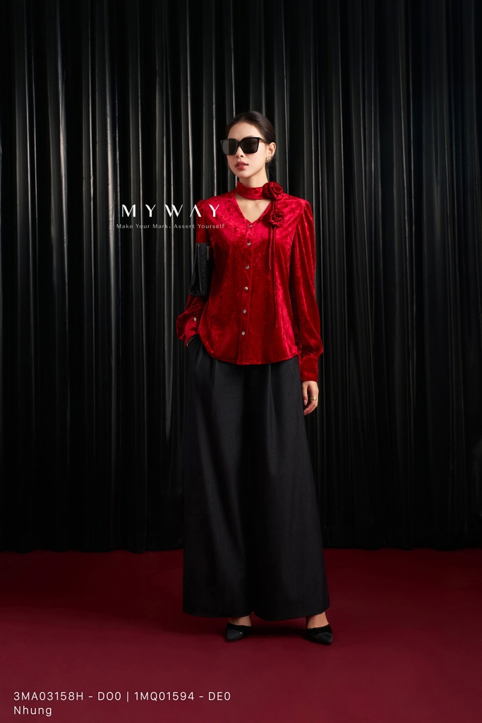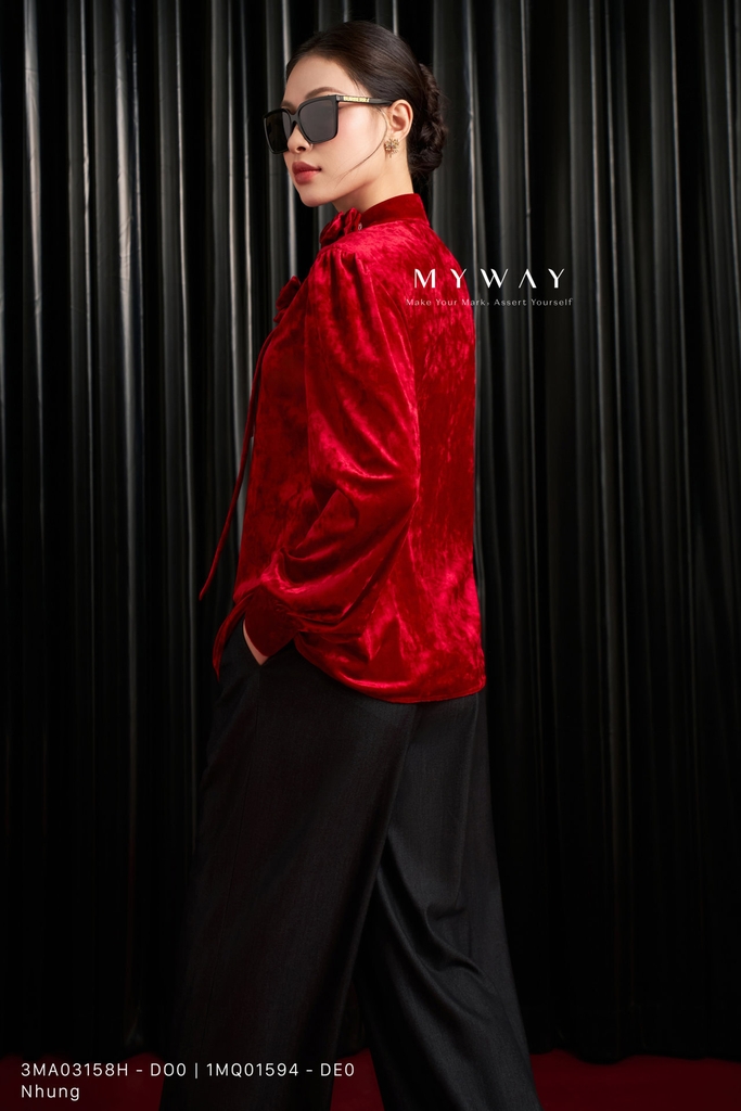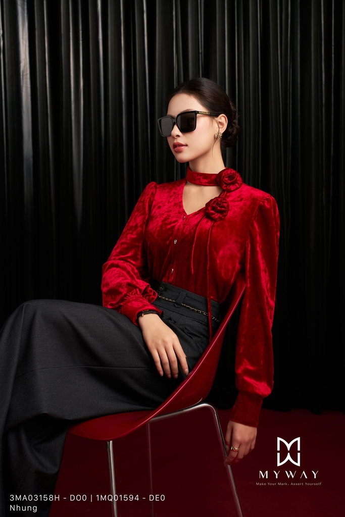 Áo kiểu dáng suông vừa với thiết kế cổ biến kiểu cách điệu, chiều dài ngang hông và tay dài mang đến vẻ ngoài thanh lịch, hiện đại; sản phẩm nổi bật với gam màu đỏ sang trọng, sắc đỏ cuốn hút giúp tôn da và tạo điểm nhấn ấn tượng trong mọi ánh nhìn; áo được thiết kế từ chất liệu nhung nhập khẩu cao cấp đã qua xử lý, bề mặt mềm mịn, bắt sáng nhẹ và lên phom chuẩn chỉnh, tôn lên nét quyến rũ tinh tế; điểm nhấn nằm ở kết cấu áo hài hòa, phần cổ được thiết kế cách điệu kết hợp cùng hoa cài trang trí nổi bật, tạo chiều sâu và sự khác biệt cho tổng thể; thiết kế dễ mặc, khéo léo che khuyết điểm cơ thể, mang lại sự thoải mái và phong cách hiện đại với khả năng phối đồ linh hoạt trong nhiều dịp khác nhau.