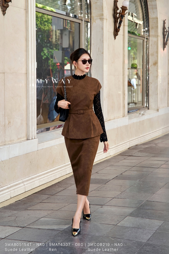 Áo kiểu suông vừa, cổ tròn, dài chùm mông với phần vai chờm nhẹ, tạo nên vẻ mềm mại và hiện đại. Sản phẩm được thiết kế từ chất liệu da lộn (màu nâu) và nhung nhập khẩu cao cấp (màu tím mận, xanh lá cây đậm) đã qua xử lý kỹ lưỡng, giúp lên phom chuẩn chỉnh và giữ dáng tốt. Điểm nhấn nằm ở kết cấu áo tinh tế kết hợp cùng chất liệu sang trọng, mang đến vẻ ngoài thanh lịch và thời thượng. Phom dáng suông vừa giúp che khuyết điểm cơ thể, dễ mặc và dễ phối đồ. Chiếc áo còn được đính kèm đai lưng, cho phép người mặc linh hoạt biến tấu phong cách từ thanh lịch đến cá tính mà vẫn giữ được nét duyên dáng và hiện đại.