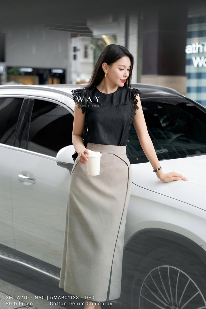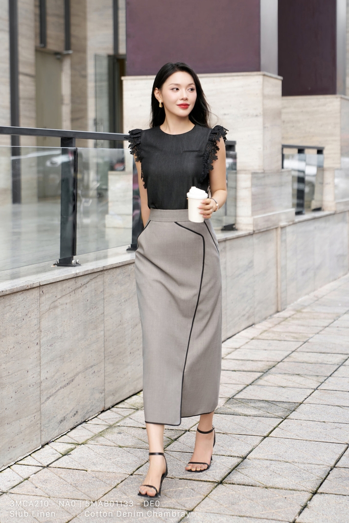 Chân váy A dáng nhẹ với độ dài qua mắt cá chân mang đến sự duyên dáng, thanh lịch và dễ ứng dụng trong nhiều hoàn cảnh khác nhau. Được thiết kế từ chất liệu Slub Linen (xước Nhật, đũi xước) nhập khẩu cao cấp đã qua xử lý, chân váy giữ phom chuẩn chỉnh, mềm mại nhưng vẫn có độ đứng cần thiết, tôn lên vóc dáng người mặc. Gam màu nâu cát sang trọng, kết hợp tinh tế với chi tiết phối đen tạo nên điểm nhấn nổi bật, vừa hiện đại vừa dễ mặc. Thiết kế có túi tiện lợi, lớp lót bên trong và khóa sau chắc chắn, giúp tăng tính ứng dụng cũng như sự thoải mái trong quá trình sử dụng. Điểm nhấn nằm ở kết cấu phối vải độc đáo, không chỉ mang lại hiệu ứng thị giác hài hòa mà còn giúp che khuyết điểm cơ thể. Với khả năng phối đồ cao, chiếc váy này gợi mở nhiều lựa chọn từ phong cách công sở lịch sự cho đến các buổi gặp gỡ nhẹ nhàng, toát lên vẻ thanh lịch và phong cách hiện đại.
