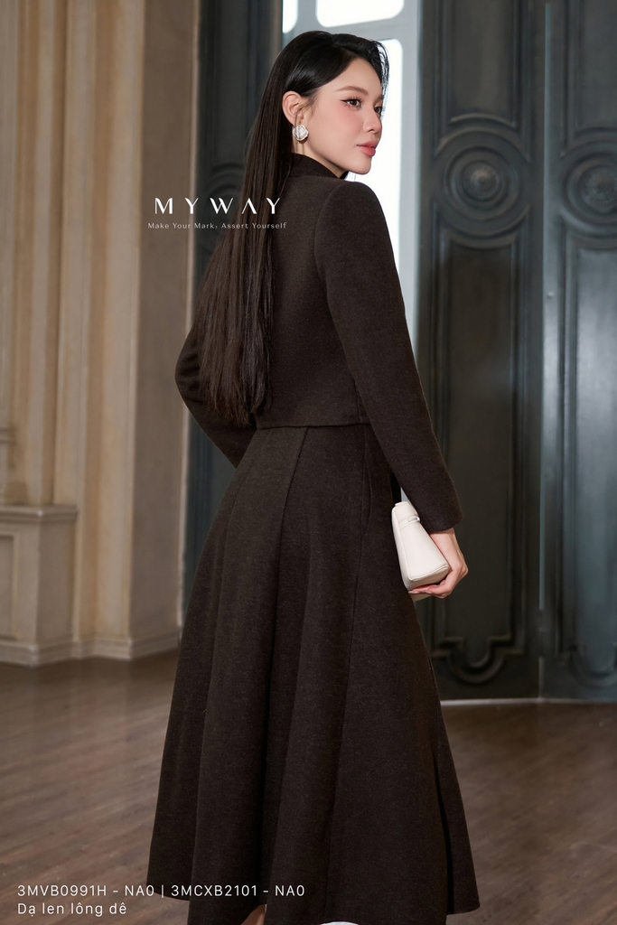 Chân váy xòe dáng xòe mềm mại, chiều dài qua bắp giúp tôn dáng và mang lại cảm giác thanh lịch, được thiết kế có túi tiện dụng và có lót tạo sự thoải mái khi mặc, đồng thời lưu ý bảo quản tránh phụ liệu và hạn chế phơi trực tiếp dưới ánh nắng để giữ bề mặt vải bền đẹp. Sản phẩm sử dụng chất liệu dạ lông dê nhập khẩu cao cấp đã qua xử lý, bề mặt vải mềm mịn, đứng phom và lên dáng chuẩn chỉnh, tạo nên vẻ quyến rũ, hiện đại. Điểm nhấn nằm ở phom dáng xòe dễ mặc kết hợp cùng chất liệu vải cao cấp, giúp che khuyết điểm cơ thể hiệu quả. Gam màu nâu trầm ấm mang sắc thái sang trọng, dễ phối cùng áo sáng màu như kem, be, trắng hoặc các tông trầm như đen, nâu đậm, phù hợp nhiều hoàn cảnh từ công sở đến dạo phố, toát lên vẻ lịch sự, phong cách hiện đại và khả năng phối đồ cao.