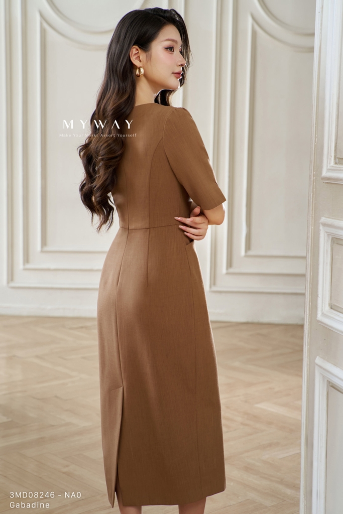 Đầm ôm dáng vừa với chiều dài qua bắp chân, thiết kế tay ngắn tinh giản và cổ biến kiểu tạo điểm nhấn duyên dáng. Sản phẩm được may từ chất liệu Gabadine nhập khẩu cao cấp, đã qua xử lý để giữ phom chuẩn chỉnh và tôn lên đường nét cơ thể. Màu tím nâu độc đáo mang đến sự sang trọng, hiện đại mà vẫn giữ được nét mềm mại, dễ phối trong nhiều hoàn cảnh. Điểm nhấn nằm ở kết cấu váy và thiết kế cổ cách điệu, giúp chiếc đầm vừa thanh lịch vừa dễ mặc, che khuyết điểm hiệu quả. Đây là lựa chọn lý tưởng cho những quý cô yêu thích vẻ tinh tế, lịch sự và khả năng phối đồ linh hoạt.