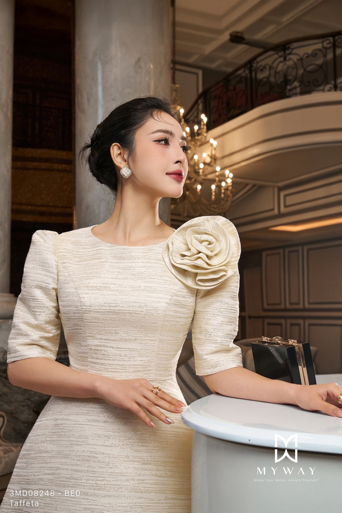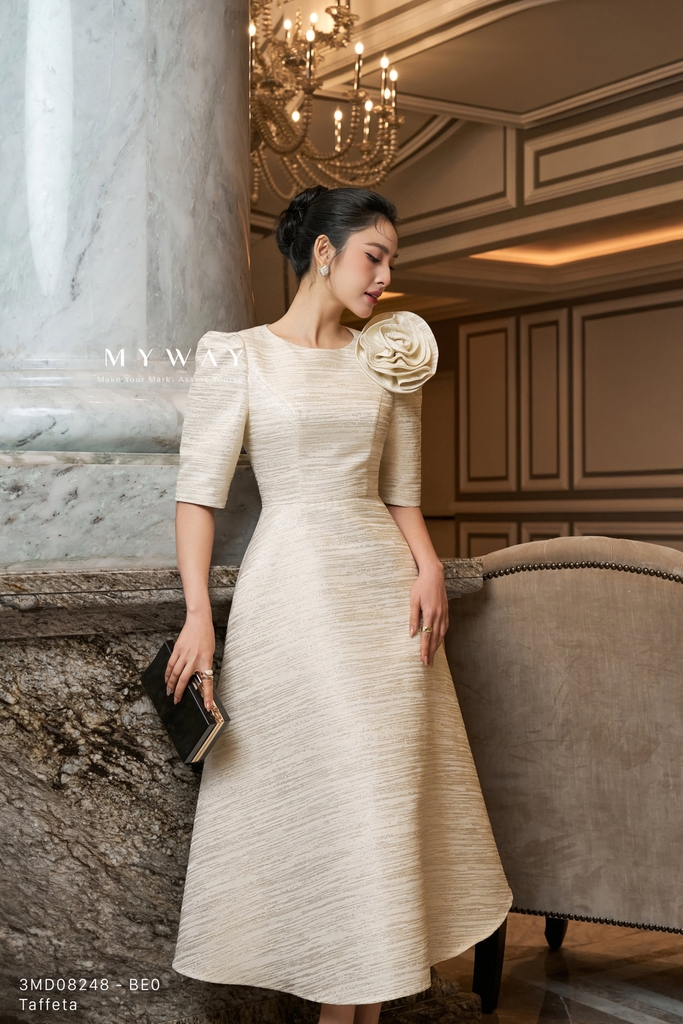 Đầm xòe được thiết kế với phom trên ôm nhẹ nhàng tôn dáng, chân váy xòe mềm mại giúp che khuyết điểm, cổ tròn thanh lịch, tay lỡ và chiều dài qua bắp tạo nên vẻ ngoài duyên dáng, hiện đại. Sản phẩm có túi tiện dụng và lớp lót bên trong mang lại cảm giác thoải mái khi mặc. Đầm được làm từ chất liệu taffeta kim tuyến nhập khẩu cao cấp đã qua xử lý, bề mặt ánh nhẹ sang trọng, giữ phom chuẩn chỉnh. Điểm nhấn nổi bật nằm ở chất liệu vải kim tuyến kết hợp hoa đính tinh tế, tạo hiệu ứng thị giác thu hút và tăng vẻ sang trọng cho tổng thể. Gam màu be kim tuyến trang nhã, ánh nhũ nhẹ nhàng giúp làn da thêm sáng, dễ phối cùng giày cao gót và phụ kiện tối giản, phù hợp cho tiệc, sự kiện hoặc những dịp cần phong cách hiện đại, sang trọng và tính ứng dụng cao.