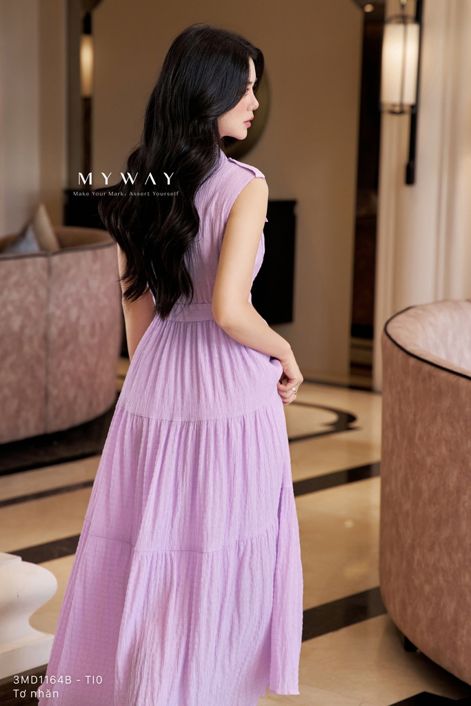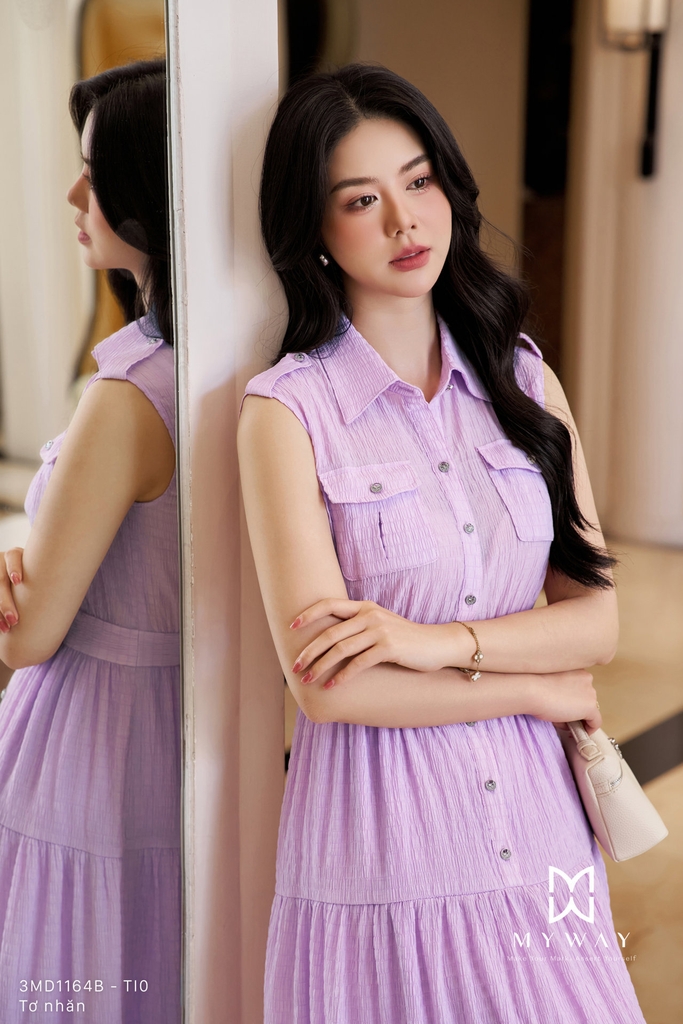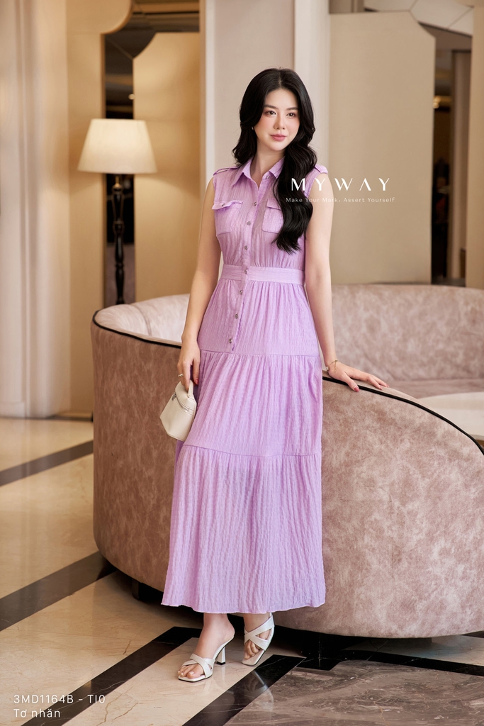 Đầm xòe dáng trên ôm dưới xòe, cổ Đức thanh lịch, dài qua bắp chân, mang đến vẻ ngoài nữ tính và hiện đại. Thiết kế không tay, không túi, có lớp lót tinh tế, phù hợp cho những dịp cần sự gọn gàng và thanh thoát.Được may từ chất liệu tơ rúm nhăn nhập khẩu cao cấp, xử lý kỹ lưỡng để giữ độ mềm mại, rủ tự nhiên nhưng vẫn đảm bảo phom dáng chuẩn chỉnh. Bề mặt vải có những nếp nhăn tự nhiên đặc trưng, tạo nên chiều sâu và sự cá tính cho tổng thể trang phục.Điểm nhấn nổi bật nằm ở kết cấu chân váy 3 tầng xếp rúm, mang đến độ bồng bềnh uyển chuyển theo từng bước di chuyển. Sắc tím chủ đạo gợi nên vẻ lãng mạn, dịu dàng nhưng không kém phần sang trọng, tôn lên sự tinh tế và gu thẩm mỹ riêng của người mặc.Chiếc đầm vừa dễ mặc, dễ phối phụ kiện, vừa toát lên phong cách hiện đại, mang lại sự thoải mái và phù hợp cho nhiều hoàn cảnh từ đi làm đến dự tiệc.