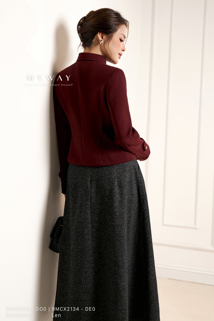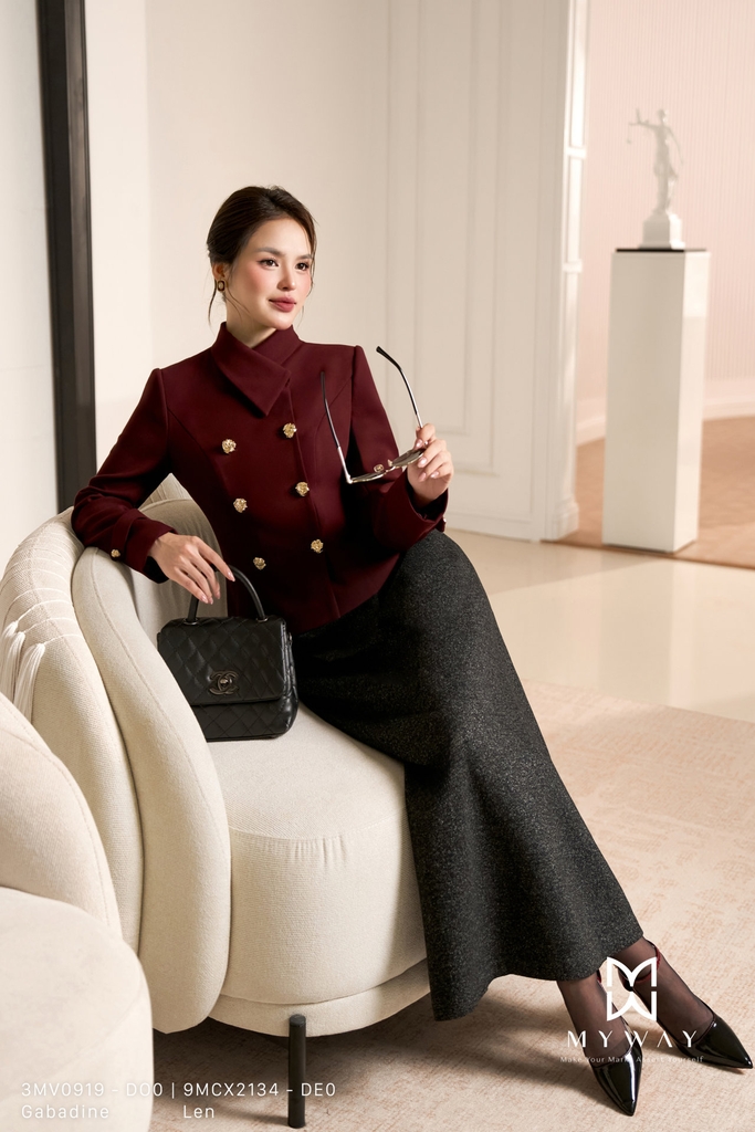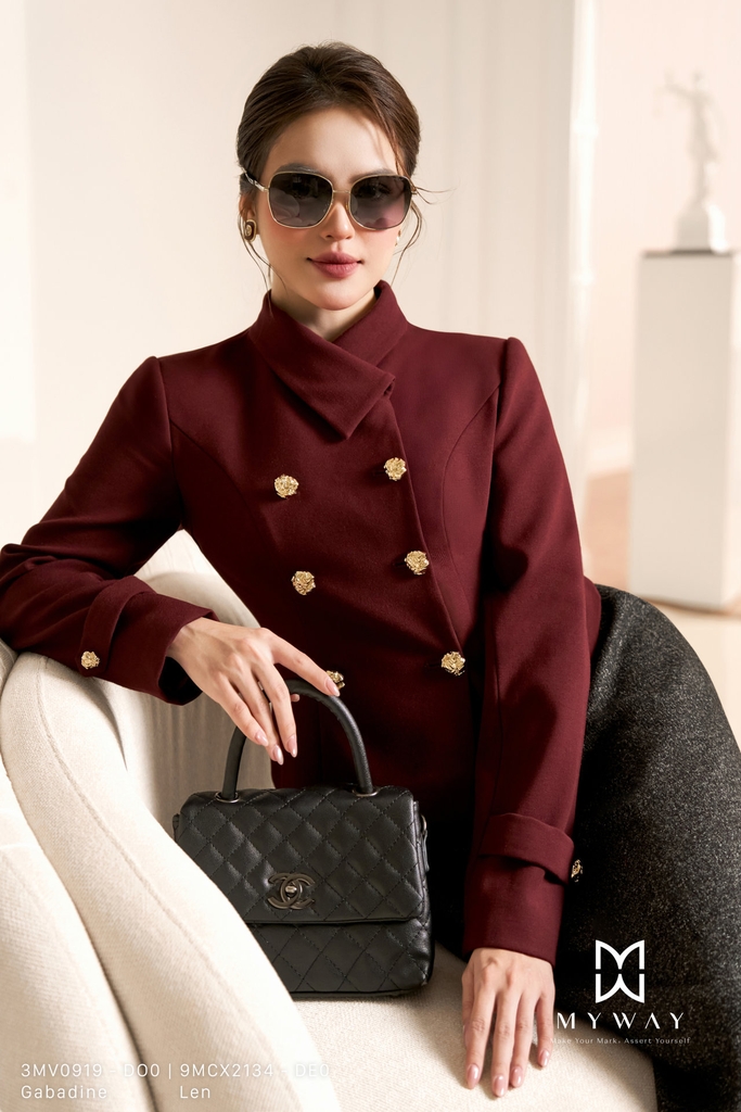 Áo khoác ôm vừa, cổ biến kiểu, dài ngang hông với tay dài, không túi và có lót, được thiết kế để mang đến sự vừa vặn và tinh tế cho người mặc. Sản phẩm làm từ chất liệu Gabadine nhập khẩu cao cấp, đã qua xử lý để giữ form chuẩn chỉnh, bền đẹp và thoải mái khi mặc. Điểm nhấn của áo nằm ở kết cấu vải tinh xảo cùng khuy trang trí nổi bật, tạo vẻ sang trọng và hiện đại. Phom áo dễ mặc, dễ phối đồ với nhiều trang phục khác nhau, giúp tôn lên phong cách thanh lịch, hiện đại mà vẫn tiện dụng trong nhiều hoàn cảnh. Màu đỏ đô mang đến vẻ ấm áp, nổi bật nhưng vẫn lịch sự.