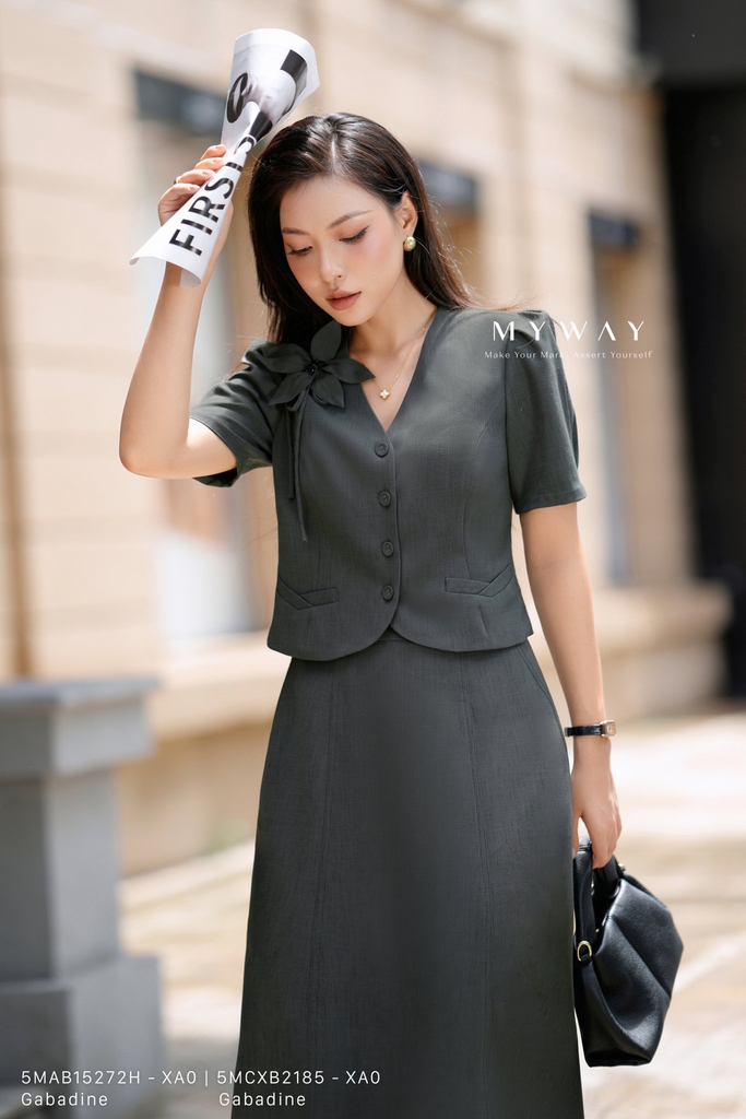 Áo kiểu ôm vừa, cổ tim, tay ngắn, dài ngang hông. Thiết kế có túi giả trang trí, hoa cài đính kèm và lớp lót tinh tế. Màu xanh ghi rêu sang trọng.Sử dụng chất liệu Gabadine nhập khẩu cao cấp đã qua xử lý, giúp giữ phom chuẩn, thoáng mát và thấm hút tốt. Phom dáng cơ bản dễ mặc, được cách điệu với các chi tiết như nắp túi, hoa cài tạo điểm nhấn thanh lịch, hiện đại.