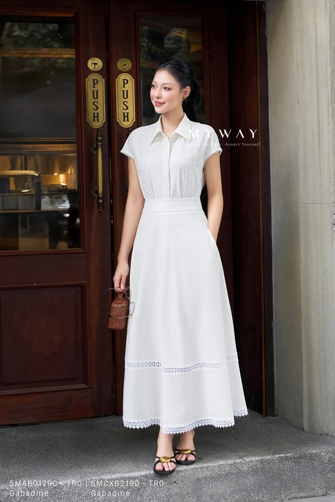 Chân váy xòe dáng dài trên mắt cá chân, thiết kế mềm mại với phom xòe rủ tự nhiên, tạo nên sự uyển chuyển và thanh thoát cho từng bước di chuyển. Điểm nhấn tinh tế nằm ở chi tiết phối dây ren trang trí hiện đại, mang lại nét sang trọng và đầy nữ tính.Sản phẩm được may từ chất liệu Gabadine nhập khẩu cao cấp, đã qua xử lý kỹ lưỡng, giúp vải có độ rủ đẹp, lên phom chuẩn chỉnh và giữ được độ bền trong quá trình sử dụng. Lớp lót mượt mà cùng khóa kéo sau tiện lợi, kết hợp với túi kín đáo, vừa đảm bảo tính thẩm mỹ vừa tăng tính ứng dụng.Màu trắng tinh khôi mang đến vẻ thanh lịch, dễ phối hợp cùng nhiều kiểu áo khác nhau, từ sơ mi công sở đến áo kiểu điệu đà.Chiếc chân váy này không chỉ đem lại sự thoải mái cho người mặc mà còn tôn lên nét duyên dáng, thanh tao và phong cách hiện đại, đồng thời phù hợp cho nhiều hoàn cảnh sử dụng khác nhau.
