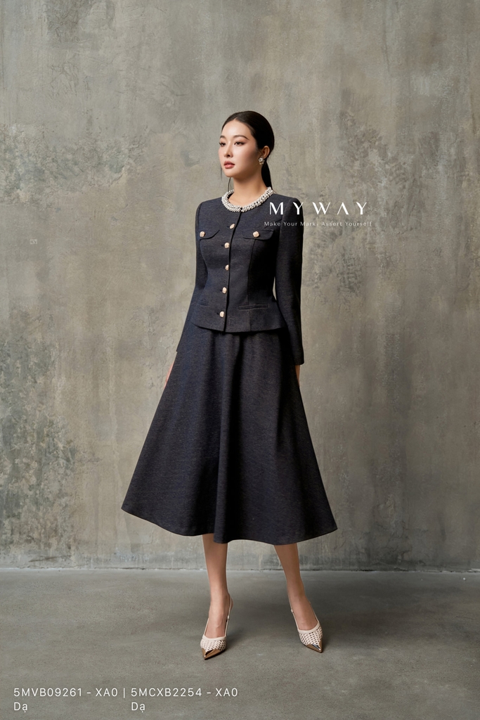 Chân váy xòe với phom xòe rủ mềm mại, dài qua bắp chân mang đến vẻ nữ tính và thanh lịch cho người mặc. Thiết kế khóa sau kín đáo, có túi tiện lợi và có lót, đảm bảo sự chỉn chu trong từng chi tiết. Sản phẩm được làm từ chất liệu dạ nhập khẩu cao cấp đã qua xử lý, giúp phom váy lên chuẩn, đứng dáng nhưng vẫn giữ được độ rủ tự nhiên. Màu xanh tím than sang trọng kết hợp cùng kết cấu vải tinh tế tạo nên điểm nhấn nổi bật, dễ ứng dụng trong nhiều hoàn cảnh. Chân váy mang lại sự thoải mái cho thượng khách, tôn lên phong thái hiện đại, thanh lịch và có khả năng phối đồ linh hoạt.