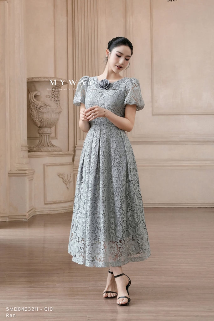 Đầm xòe xếp ly cổ thuyền, tay ngắn, dài ngang bắp mang đến vẻ đẹp thanh lịch và nữ tính. Thiết kế nổi bật với gam màu ghi trung tính làm nền, điểm xuyết họa tiết hoa lá tinh tế, tạo cảm giác hài hòa và sang trọng. Được chế tác từ chất liệu ren nhập khẩu cao cấp, chiếc đầm không chỉ giữ phom chuẩn chỉnh mà còn tạo sự thoáng mát, dễ chịu khi mặc. Phom xòe xếp ly hiện đại kết hợp kết cấu bổ xẻ lạ mắt, tô điểm thêm hoa cài tỉ mỉ, cầu kỳ, tạo điểm nhấn đầy cuốn hút. Sự kết hợp màu sắc tinh tế giúp người mặc toát lên vẻ thanh lịch, phong cách hiện đại và dễ dàng phối cùng nhiều phụ kiện.