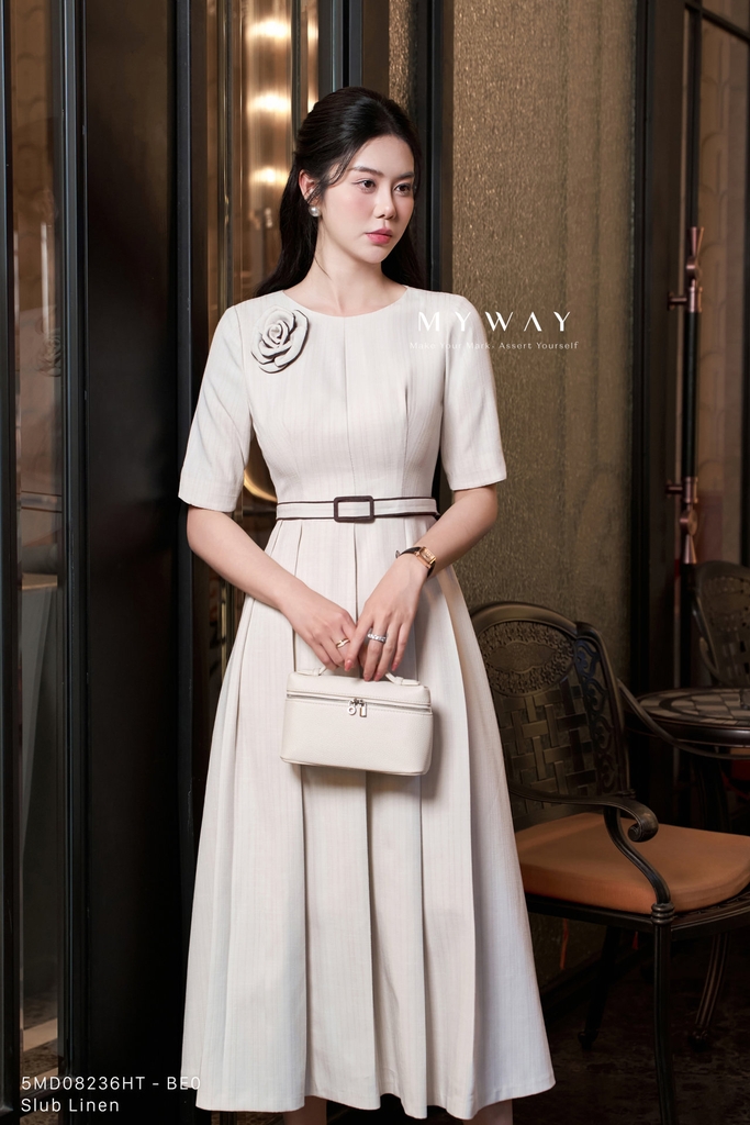 Đầm xòe xếp ly dáng cổ thuyền thanh lịch, dài qua bắp chân, tay ngắn, khóa kéo sau tiện dụng, có túi và lớp lót mềm mại tạo cảm giác thoải mái khi mặc. Sản phẩm được thiết kế từ chất liệu Slub Linen (xước Nhật, đũi xước) nhập khẩu cao cấp, đã qua xử lý kỹ lưỡng giúp giữ phom chuẩn chỉnh, thấm hút tốt và mang lại vẻ tự nhiên, sang trọng. Phom dáng xòe xếp ly hiện đại kết hợp tinh tế cùng hoa cài và thắt lưng phối màu lạ mắt tạo điểm nhấn nổi bật cho tổng thể trang phục. Màu be trang nhã giúp tôn lên vẻ nhẹ nhàng, nữ tính và dễ dàng phối hợp cùng nhiều phụ kiện khác nhau. Chiếc đầm mang lại sự thoải mái cho người mặc, toát lên nét thanh lịch, hiện đại và thời thượng, phù hợp cho nhiều dịp từ công sở đến sự kiện.