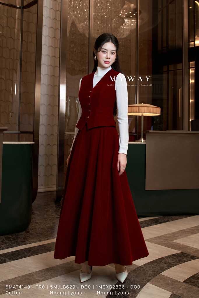 Áo kiểu suông ôm dáng, cổ tim thanh lịch, dài ngang hông, được thiết kế không tay và có lớp lót mềm mại giúp giữ phom chuẩn chỉnh. Sản phẩm được làm từ chất liệu Nhung Lyons (nhung cứng) nhập khẩu cao cấp, đã qua xử lý để tạo độ bóng sang trọng và thấm hút tốt, mang lại cảm giác thoải mái khi mặc. Thiết kế nổi bật với phần khuy trang trí mạ vàng tinh tế, tạo điểm nhấn hiện đại và sang trọng. Màu đỏ thắm quyến rũ giúp tôn lên nét quý phái, dễ phối cùng sơ mi hoặc áo thun bên trong, phù hợp cho cả phong cách công sở và thời trang dạo phố. Áo mang lại vẻ thanh lịch, phong cách hiện đại cùng khả năng phối đồ cao, là lựa chọn lý tưởng cho người yêu thích sự tinh tế và sang trọng.