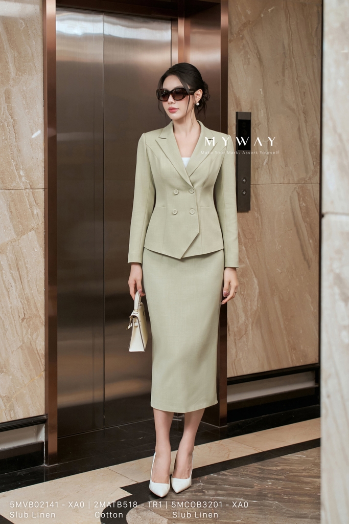 Áo vest dáng cơ bản với cổ hai ve thanh lịch và chiều dài ngang mông mang đến vẻ ngoài chỉn chu, hiện đại nhưng vẫn giữ được nét mềm mại, nữ tính. Thiết kế tôn dáng với phần đệm vai nhẹ giúp phom áo đứng chuẩn, tạo nên cấu trúc cân đối và tinh tế cho người mặc. Gam xanh cốm dịu nhẹ, tươi sáng là điểm nhấn ấn tượng, mang đến cảm giác thanh mát, trẻ trung mà không kém phần sang trọng. Áo được may từ chất liệu Slub Linen (đũi xước Nhật) nhập khẩu cao cấp, có độ bền và khả năng thấm hút tốt, tạo cảm giác thoải mái trong suốt ngày dài. Phom dáng basic linh hoạt, dễ dàng phối cùng chân váy, quần suông hay đầm liền, giúp quý cô dễ dàng biến tấu phong cách từ công sở đến dạo phố, toát lên vẻ thanh lịch, hiện đại và đầy cuốn hút.