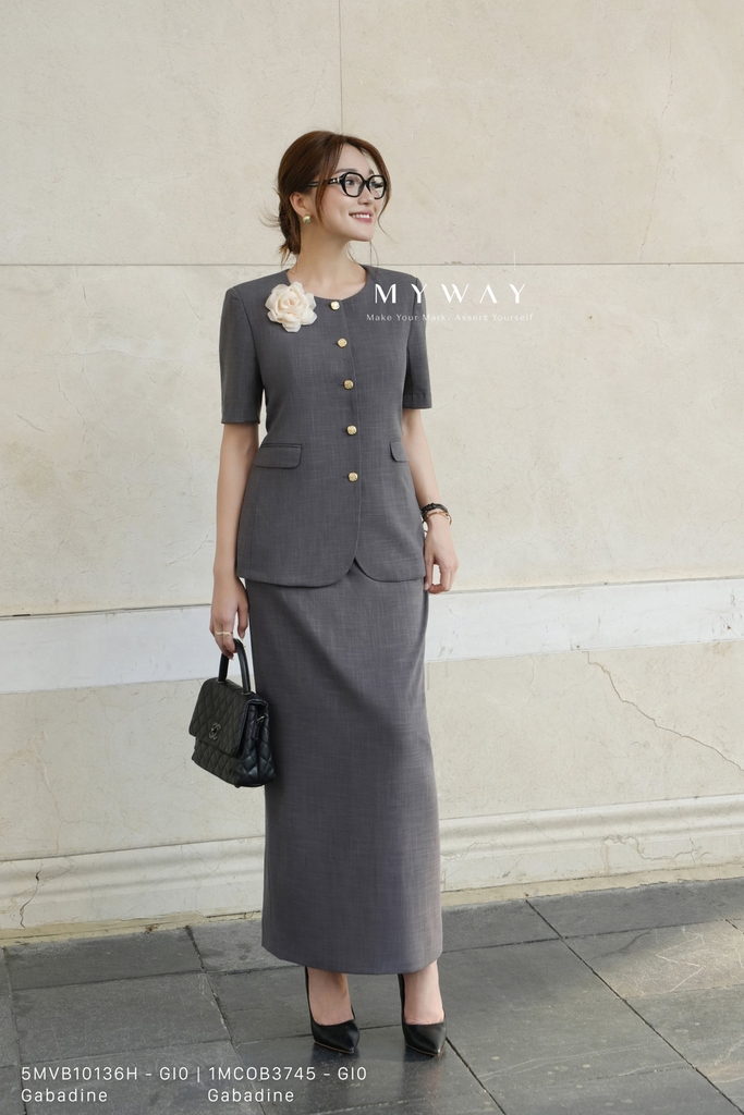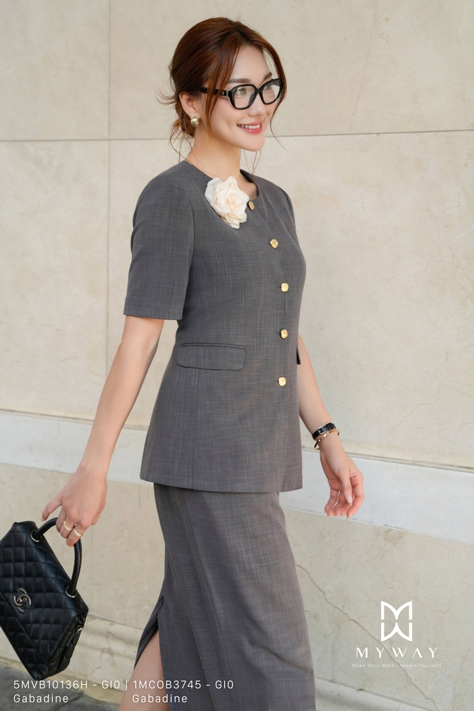 Áo vest suông vừa, cổ tròn, dài chùm mông, tay ngắn. Thiết kế có đệm vai/ken vai tạo phom đứng, kèm túi tiện dụng và lót trong cao cấp. Tinh tế với chất liệu vải Gabadine màu ghi nhập khẩu cao cấp, đã qua xử lý để giữ phom chuẩn chỉnh, bề mặt vải mịn, sang trọng và bền đẹp.Phom dáng suông vừa hiện đại, trẻ trung, kết hợp cùng phần hoa cài phối màu ghi cá tính nổi bật, giúp tăng điểm nhấn và dễ phối hợp với nhiều kiểu trang phục. Sản phẩm mang lại sự thoải mái khi mặc, đồng thời toát lên vẻ thanh lịch, phong cách hiện đại và khả năng phối đồ cao – phù hợp cho cả công sở, sự kiện hay dạo phố.