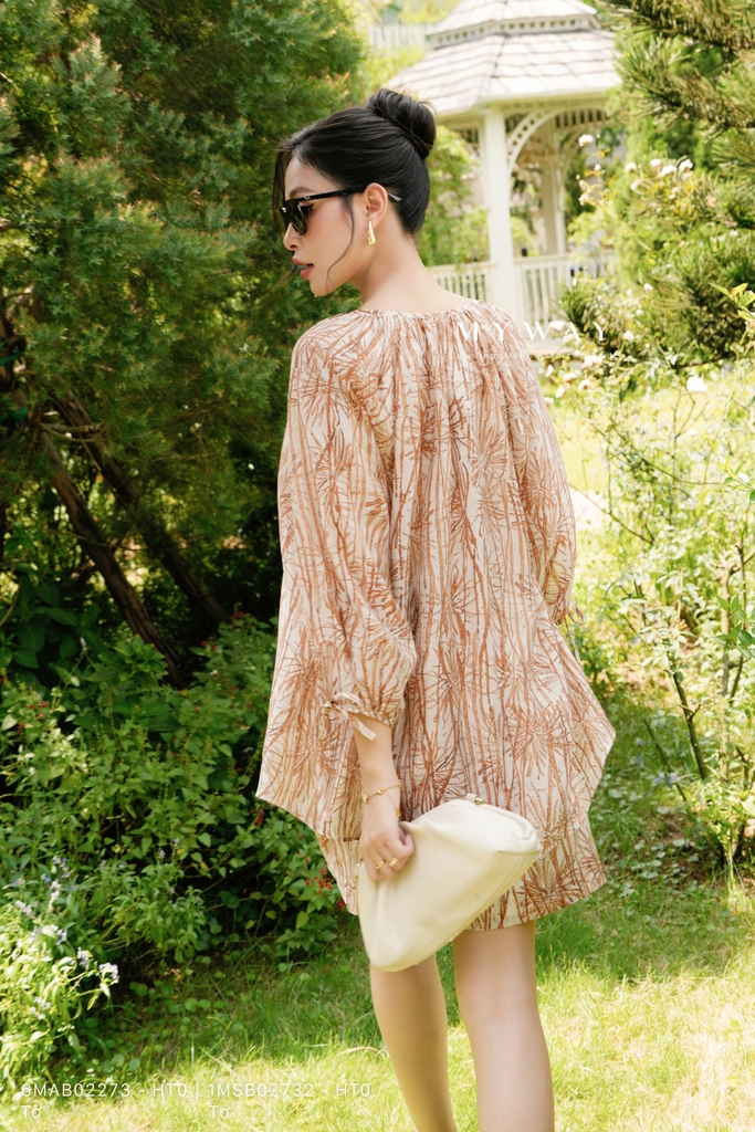 Áo sơ mi dáng suông A, cổ cách điệu, tay lỡ, dài chùm mông, không có lót, được thiết kế tinh tế với họa tiết lá cây trên nền be họa tiết nâu độc đáo. Sản phẩm sử dụng chất liệu tơ nhập khẩu cao cấp đã qua xử lý, giúp giữ phom chuẩn chỉnh, tạo nên form dáng quyến rũ và hiện đại. Điểm nhấn nổi bật của áo là phần họa tiết vải lạ mắt kết hợp với phom suông dễ mặc, mang lại sự thoải mái cho thượng khách, đồng thời toát lên vẻ thanh lịch, phong cách hiện đại và khả năng phối đồ cao.