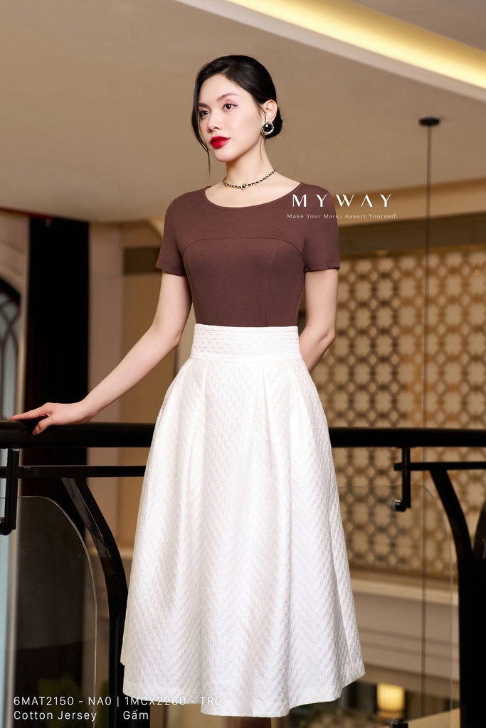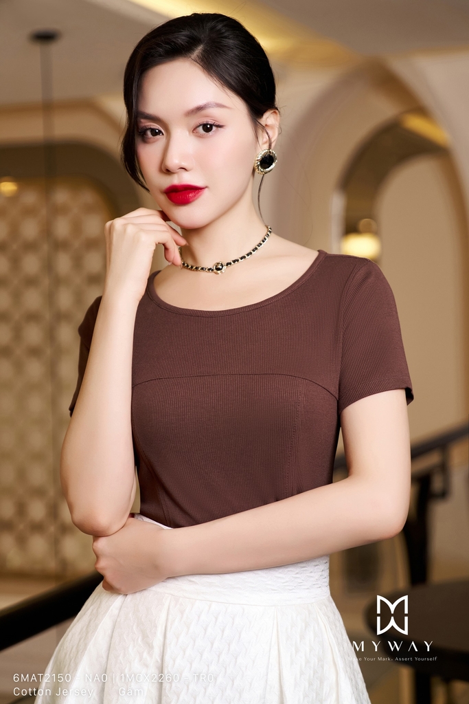 Áo thun ôm body, dài ngang hông, không có lót, không có túi. Tinh tế cùng cổ tròn mang lại cảm giác kiêu sa, thanh lịch. Tay áo ngắn cùng gam màu nâu tạo điểm nhấn cho người mặc.
