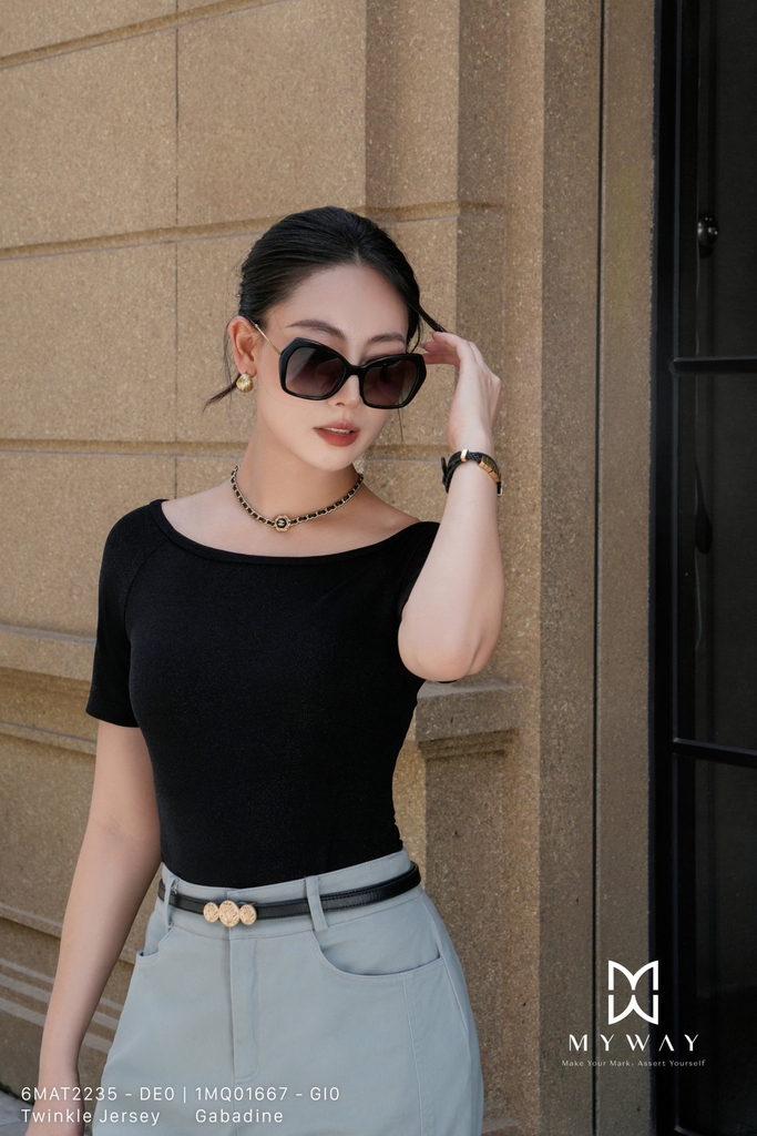 Áo thun ôm vừa, dài ngang mông, tay ngắn, không có lót. Tinh tế cùng chi tiết cổ thuyền phóng khoáng và ôm body tôn dáng, kết hợp tone đen basic cùng họa tiết kim tuyến chìm tạo điểm nhấn cho người mặc. Thiết kế áo thun trơn dễ mặc, dễ phối để nàng thoải mái mix&match dịp hè.