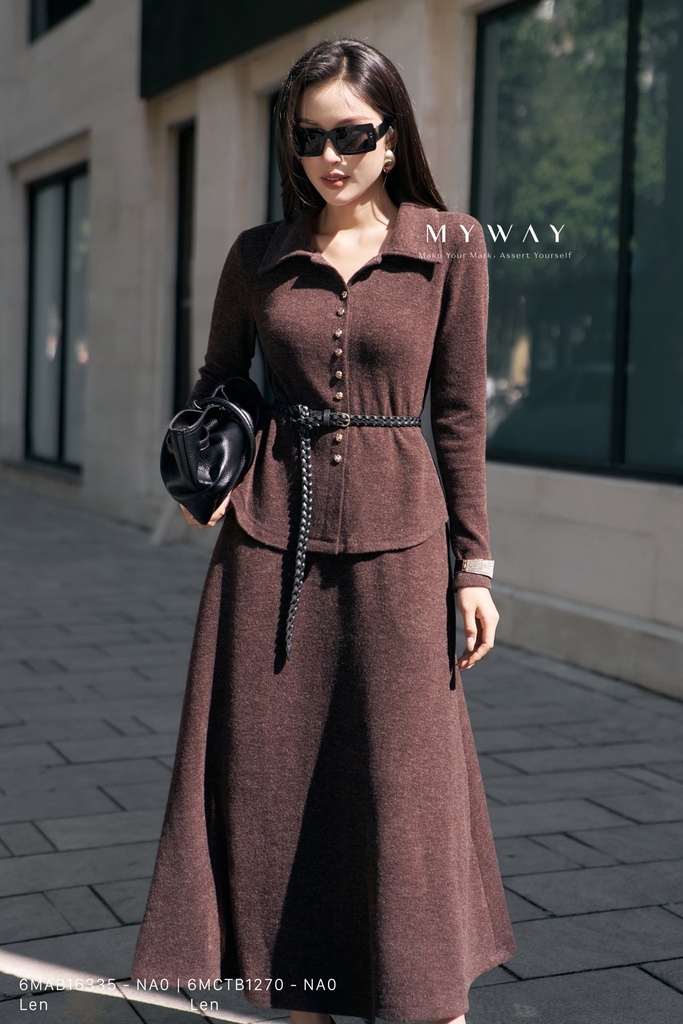 Chân váy xòe rủ xòe mềm mại, dài qua bắp, không lót, màu nâu ấm áp, được làm từ chất liệu len nhập khẩu cao cấp đã qua xử lý, giữ phom chuẩn chỉnh và tạo dáng hiện đại, quyến rũ. Điểm nhấn tinh tế nằm ở chất liệu vải cùng phom dáng dễ mặc, giúp che khuyết điểm cơ thể. Chân váy mang lại sự thoải mái tối đa cho thượng khách, toát lên vẻ thanh lịch, phong cách hiện đại và khả năng phối đồ cao.