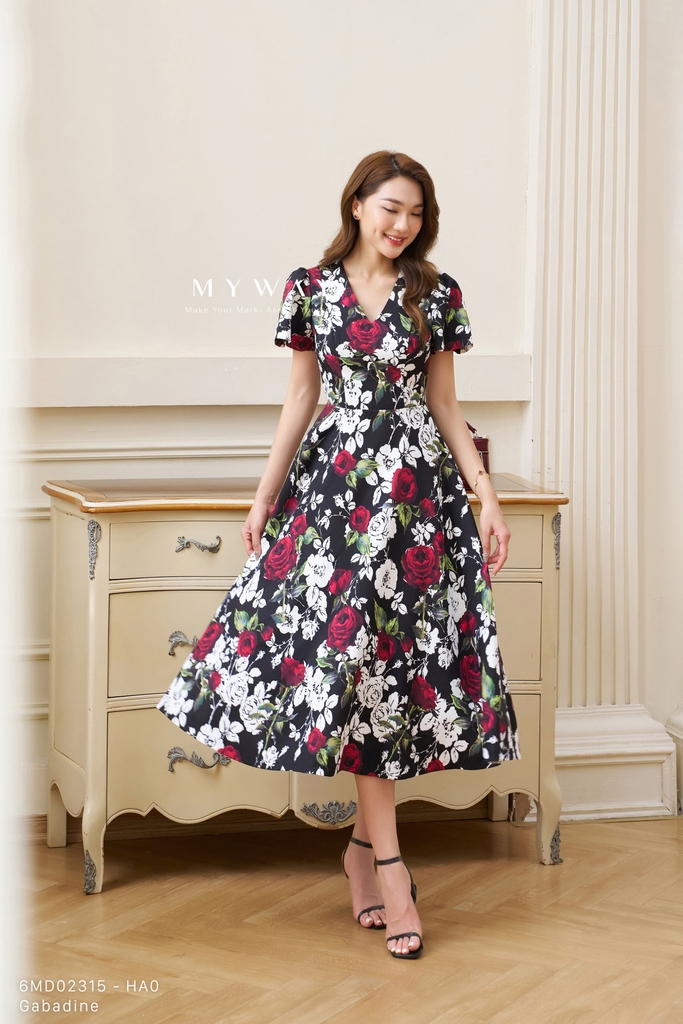 Đầm xòe dáng trên ôm, chân váy xòe rủ mềm mại, cổ tim duyên dáng, tay ngắn, dài qua bắp chân. Thiết kế có khóa sau, đi kèm túi tiện lợi và lớp lót cao cấp, mang lại sự thoải mái và an toàn khi mặc.Sản phẩm được may từ chất liệu Gabadine nhập khẩu cao cấp, đã qua xử lý để giữ phom chuẩn chỉnh, bề mặt vải mịn, rủ vừa phải, tôn dáng quyến rũ và hiện đại.Điểm nhấn nổi bật của chiếc đầm là họa tiết hoa lá sắc nét trên nền đen sang trọng. Những cành lá xanh hòa quyện cùng sắc hoa tươi tắn, tạo nên sự tương phản ấn tượng và đầy thu hút. Gam đen chủ đạo vừa giúp tôn dáng, vừa làm nổi bật sự thanh lịch và dễ ứng dụng trong nhiều hoàn cảnh.Chiếc đầm mang lại sự thoải mái cho người mặc, toát lên vẻ thanh lịch, phong cách hiện đại và khả năng phối đồ cao, phù hợp cả khi đi làm, dự tiệc hay dạo phố.