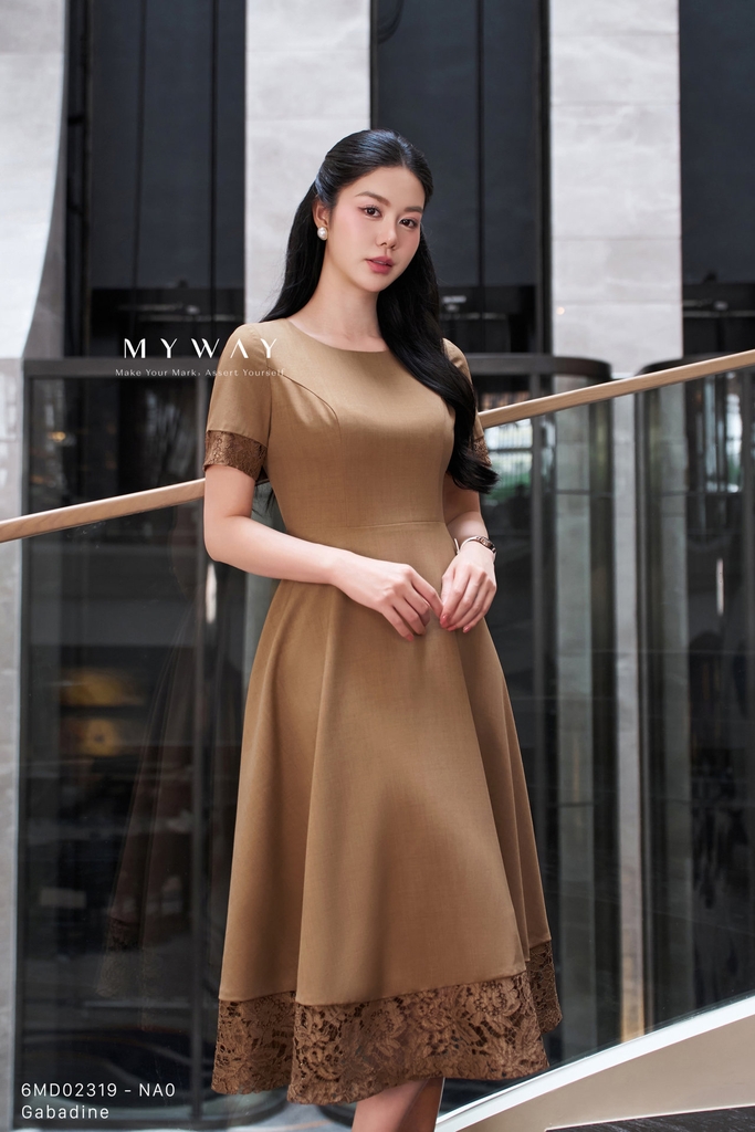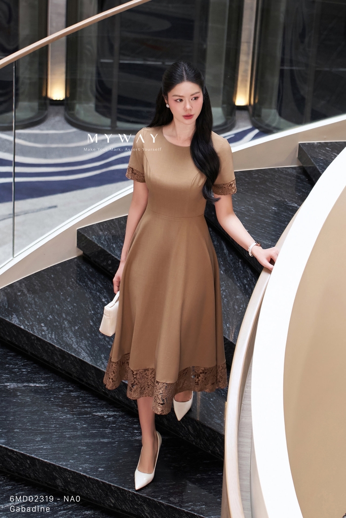 Đầm xòe rủ dáng cơ bản với thiết kế cổ tròn, tay ngắn, độ dài qua bắp mang đến vẻ thanh lịch và nữ tính. Sản phẩm có túi tiện lợi, lớp lót tinh tế cùng chi tiết phối ren độc đáo, tạo điểm nhấn mềm mại và sang trọng. Được may từ chất liệu Gabadine nhập khẩu cao cấp đã qua xử lý, chiếc đầm giữ phom chuẩn chỉnh, thấm hút tốt, mang lại sự thoải mái tối đa cho người mặc. Với gam màu nâu trầm ấm, phom dáng dễ mặc và khả năng che khuyết điểm cơ thể, đầm phù hợp cho nhiều dịp khác nhau, toát lên vẻ thanh lịch, phong cách classic hiện đại và khả năng phối đồ linh hoạt.
