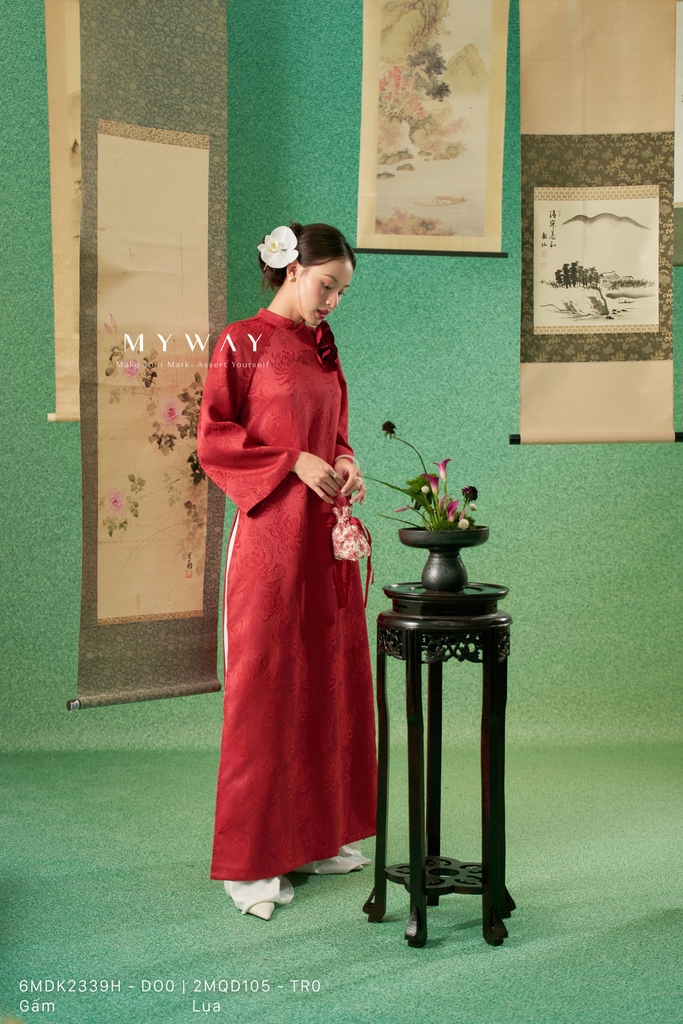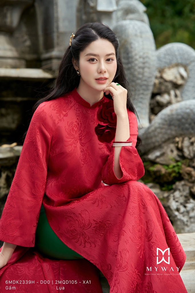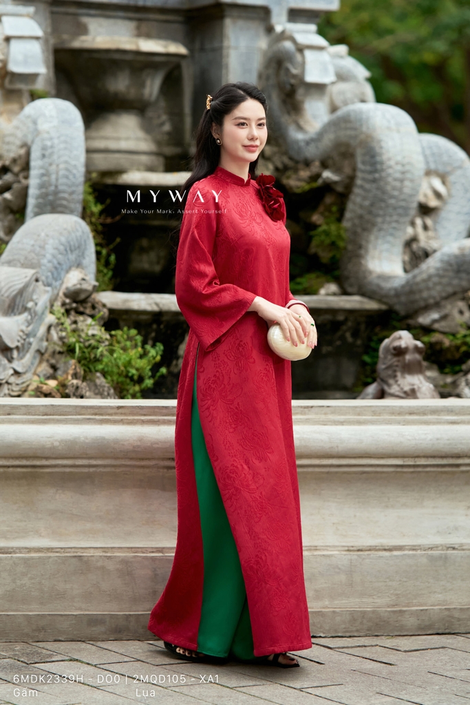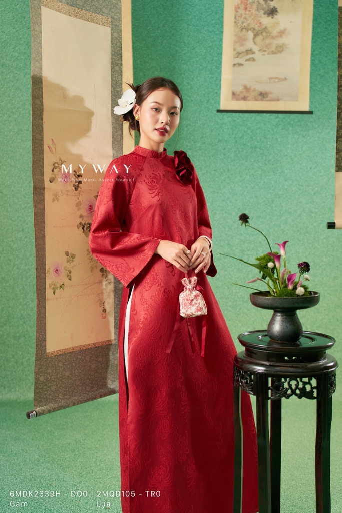 Áo dài dáng suông vừa với cổ tàu trang nhã, chiều dài qua mắt cá chân và tay dài mang đến vẻ kín đáo, thanh lịch nhưng vẫn hiện đại, giúp tôn dáng và tạo cảm giác thoải mái khi mặc. Thiết kế được thực hiện từ chất liệu gấm nhập khẩu cao cấp đã qua xử lý, bề mặt vải đứng phom, họa tiết hoa chìm tinh tế tạo chiều sâu và hiệu ứng sang trọng cho tổng thể. Điểm nhấn nổi bật là chi tiết hoa cài 3D được đính khéo léo, làm tăng tính thẩm mỹ và sự cuốn hút cho trang phục, kết hợp cùng phom suông vừa dễ mặc, giúp che khuyết điểm cơ thể hiệu quả. Sắc đỏ chủ đạo mang đến cảm giác nổi bật, quyền quý và đầy sức sống, tôn lên vẻ thanh lịch, sang trọng và phong cách hiện đại, đồng thời dễ dàng phối cùng nhiều phụ kiện để phù hợp với các dịp khác nhau.