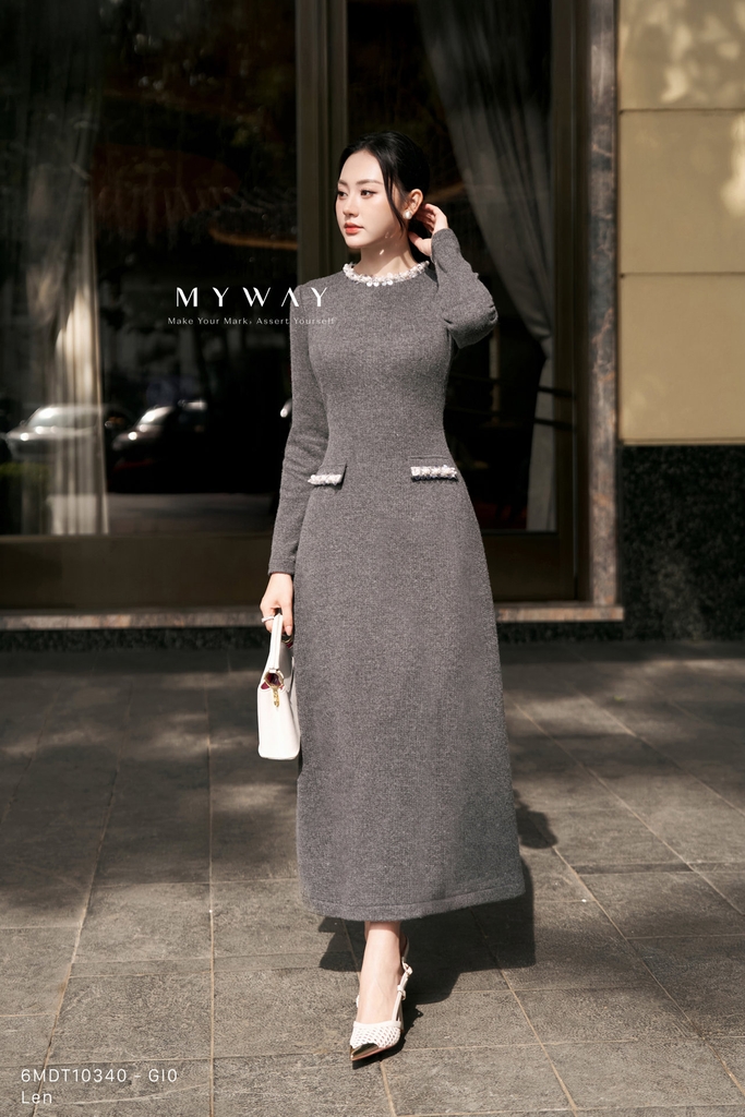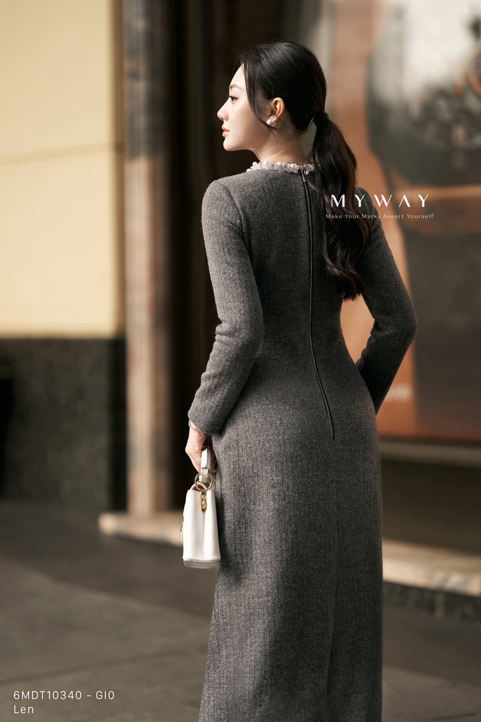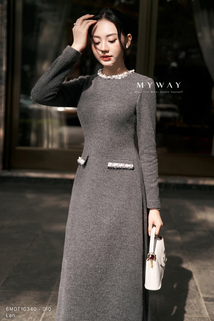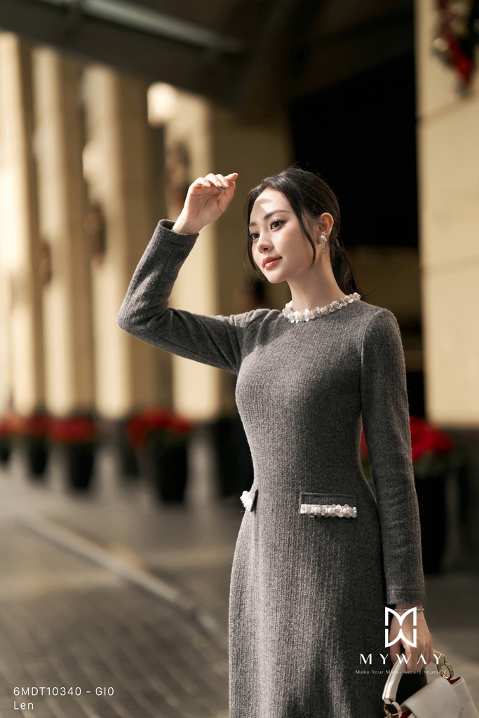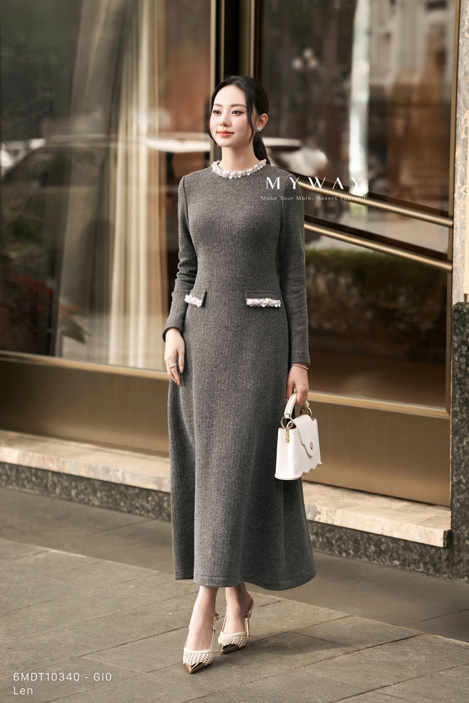 Đầm xòe rủ được thiết kế với phần thân trên ôm nhẹ kết hợp chân váy xòe rủ mềm mại, cổ tròn thanh lịch và chiều dài qua bắp tôn dáng. Thiết kế tay dài cùng khóa sau mang lại sự gọn gàng và dễ mặc, không lót tạo cảm giác nhẹ nhàng, thoải mái khi sử dụng. Điểm nhấn tinh tế nằm ở chi tiết phối dây cườm đính quanh cổ kết hợp vân vải nổi bật, giúp tổng thể thêm phần sang trọng và cuốn hút. Sản phẩm sử dụng gam màu ghi nhã nhặn, hiện đại, dễ ứng dụng và phù hợp với nhiều tông da cũng như hoàn cảnh khác nhau. Được làm từ chất liệu len nhập khẩu cao cấp, thiết kế giữ phom chuẩn chỉnh, mang đến vẻ thanh lịch, tinh tế và khả năng phối đồ cao cho người mặc.