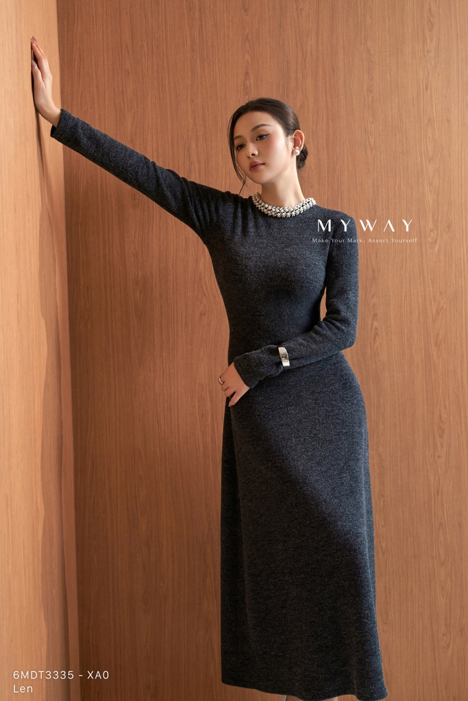 Đầm xòe được thiết kế theo phom trên ôm gọn gàng, dưới xòe mềm mại, cổ tròn thanh lịch, chiều dài qua bắp kết hợp tay dài tạo nên tổng thể duyên dáng và hiện đại, phù hợp cho nhiều hoàn cảnh sử dụng. Sản phẩm sử dụng chất liệu len nhập khẩu cao cấp đã qua xử lý, bề mặt vải mịn đẹp, độ co giãn vừa phải, giúp giữ phom chuẩn chỉnh và mang lại cảm giác thoải mái khi mặc. Điểm nhấn tinh tế nằm ở phần cổ được đính cườm và hạt trai tỉ mỉ, tạo hiệu ứng trang nhã và sang trọng, đồng thời làm nổi bật phom dáng nữ tính của thiết kế. Gam màu xanh tím than mang sắc độ trầm sâu, sang và hiện đại, dễ dàng tôn da, phù hợp phối cùng phụ kiện ánh kim, giày tối màu hoặc các tông trung tính, giúp tổng thể trang phục toát lên vẻ thanh lịch, hiện đại và có khả năng ứng dụng cao.