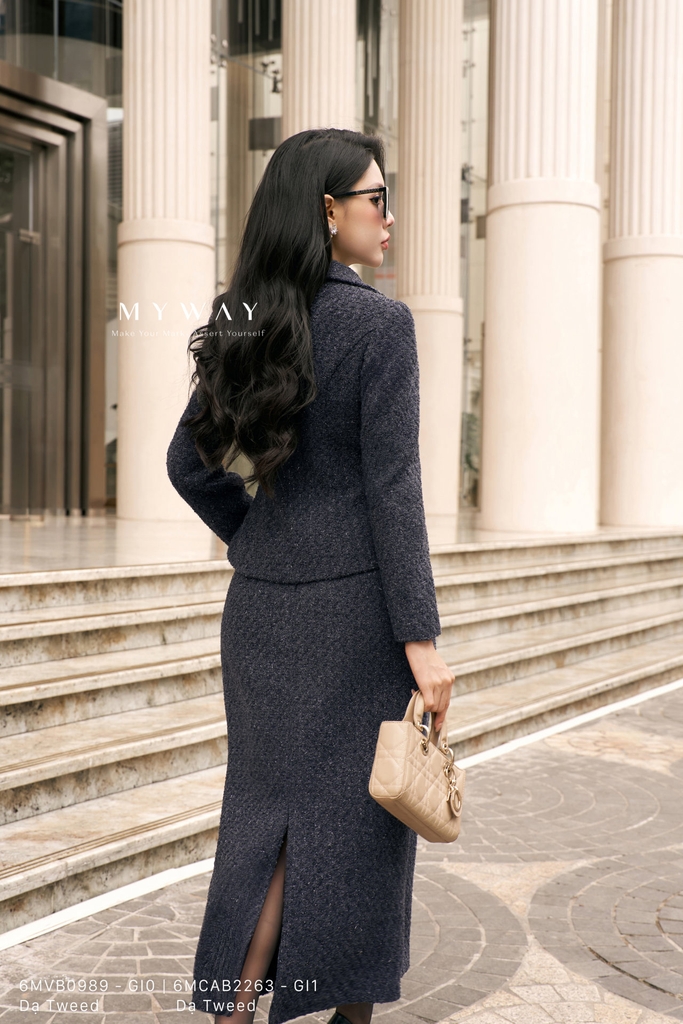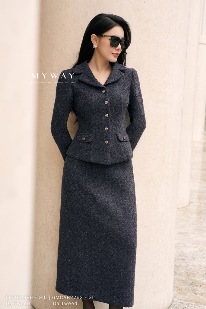 Áo vest ôm vừa, cổ 2 ve, dài ngang mông với tay dài và phần đệm vai tinh tế, có lớp lót, được làm từ dạ tweed nhập khẩu cao cấp giữ phom chuẩn chỉnh, tạo form hiện đại, quyến rũ và thoải mái khi mặc. Sản phẩm nổi bật với chi tiết khuy trang trí kim tuyến chìm ghi sang trọng, kết hợp cùng chất liệu dạ cao cấp và phom dáng tinh tế, mang đến vẻ thanh lịch, thời thượng. Thiết kế dễ phối đồ, phù hợp nhiều phong cách và hoàn cảnh, đồng thời đảm bảo sự thoải mái tối đa cho người mặc.