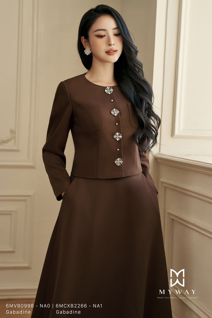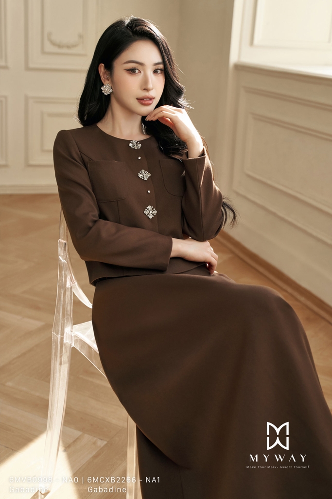 Áo vest phom suông vừa với thiết kế cổ tròn và chiều dài ngang hông mang đến vẻ thanh lịch nhẹ nhàng. Tay dài cùng lớp lót bên trong giúp áo giữ phom chuẩn chỉnh, tạo cảm giác thoải mái khi mặc. Gam màu nâu trầm sang trọng làm nổi bật chất liệu Gabadine nhập khẩu cao cấp sau xử lý, cho bề mặt vải mịn, đứng form và hiện đại. Điểm nhấn đặc biệt nằm ở chi tiết đính cườm và hạt trai tinh xảo, tạo hiệu ứng lấp lánh vừa đủ, tôn nét nữ tính mà vẫn giữ được sự trang nhã. Tổng thể thiết kế hài hòa, dễ phối đồ và phù hợp nhiều phong cách, giúp thượng khách tự tin và thanh lịch trong mọi hoàn cảnh.