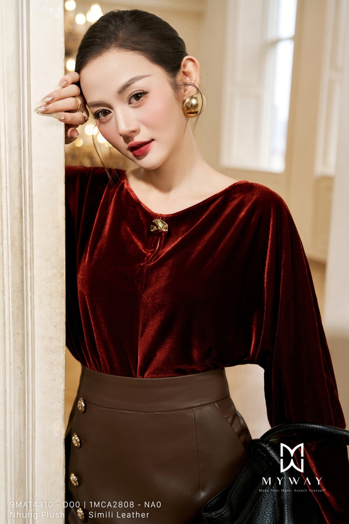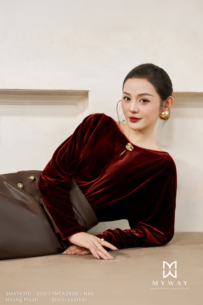 Áo kiểu dáng suông vừa, cổ biến kiểu, tay dài, dài ngang hông, được thiết kế tinh tế với điểm nhấn ở kết cấu vải và hàng khuy trang trí nổi bật. Sản phẩm được làm từ chất liệu Nhung Plush (nhung mềm) nhập khẩu cao cấp đã qua xử lý, mang đến bề mặt mịn màng, sang trọng và cảm giác ấm áp khi mặc. Tông màu nâu và đỏ nâu tạo nên vẻ đẹp trầm ấm, thanh lịch nhưng vẫn cuốn hút và hiện đại. Phom áo suông vừa giúp tôn dáng, dễ mặc, che khuyết điểm cơ thể một cách tinh tế. Thiết kế này mang lại sự thoải mái cho thượng khách, toát lên phong thái thanh lịch, hiện đại và có khả năng phối đồ linh hoạt, phù hợp cho nhiều hoàn cảnh khác nhau.
