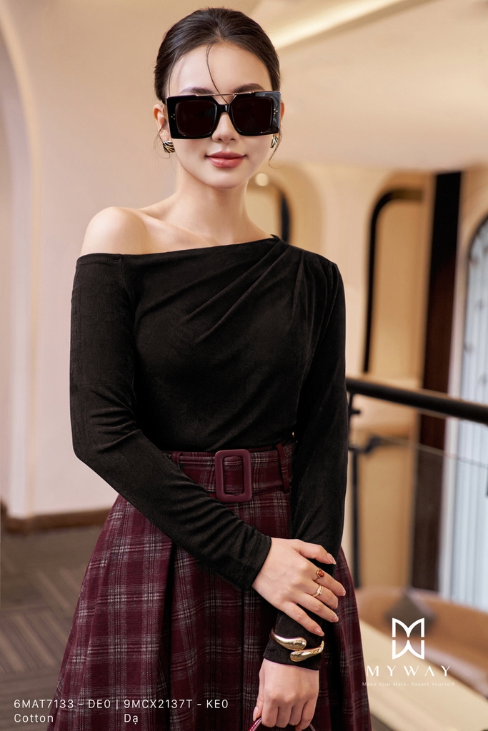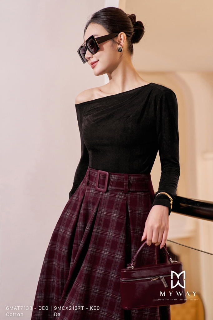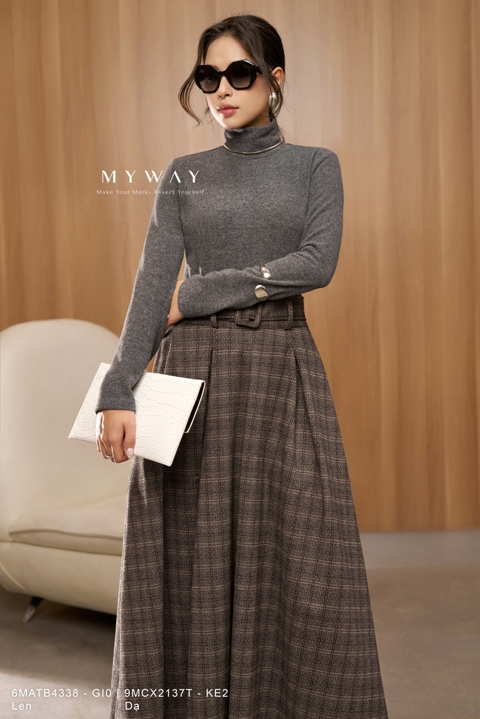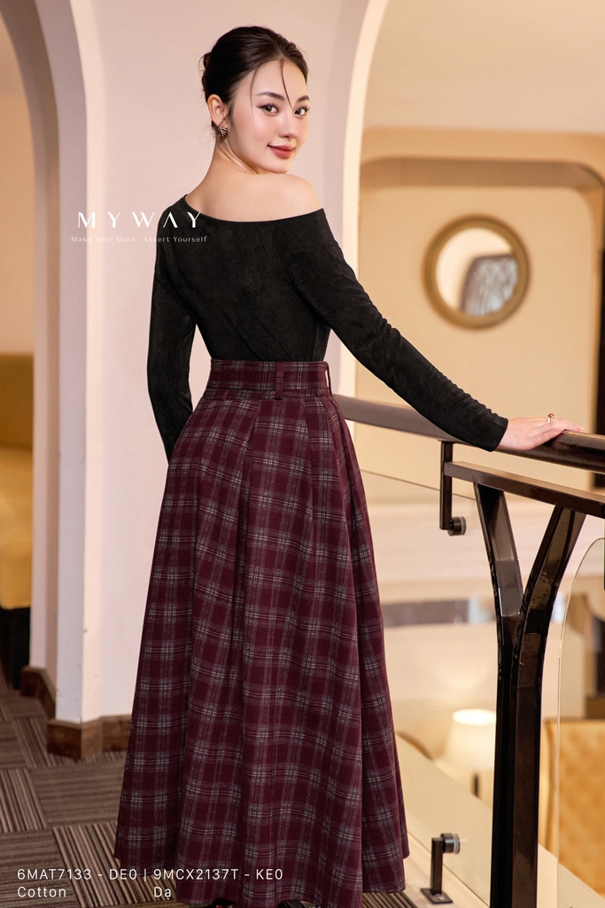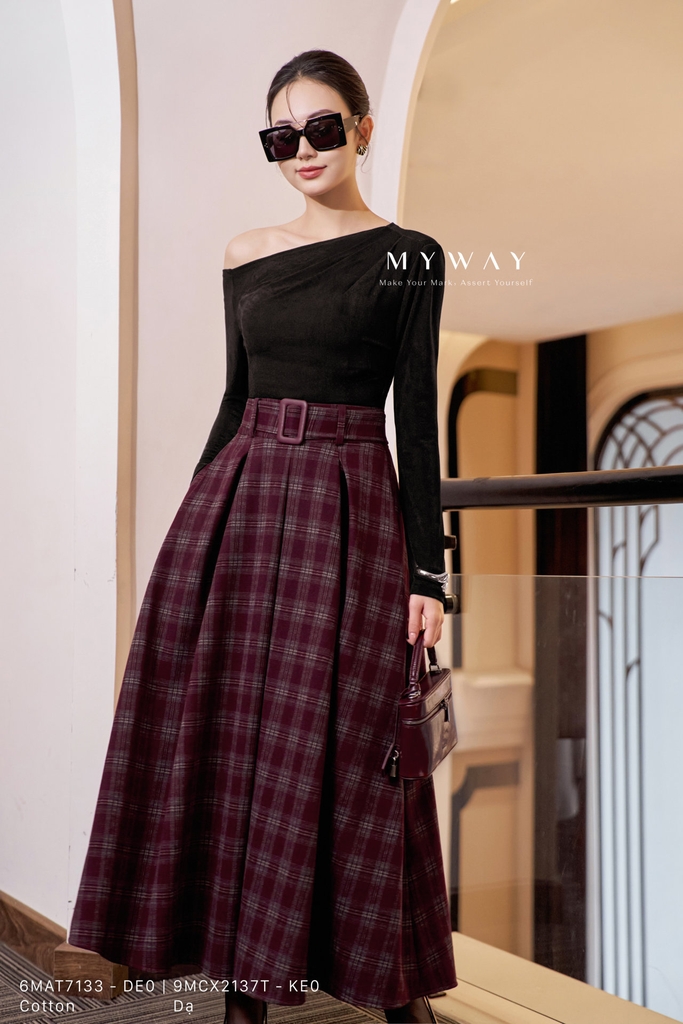 Chân váy xòe xếp ly dài qua bắp, có túi và lót, nổi bật với các phiên bản kẻ đỏ, kẻ xanh tím than và kẻ nâu, mang đến vẻ thanh lịch và hiện đại. Sản phẩm được làm từ chất liệu dạ nhập khẩu cao cấp đã qua xử lý, giữ phom chuẩn chỉnh và tạo form quyến rũ. Điểm nhấn của chân váy nằm ở phom dáng xòe xếp ly tinh tế cùng chất liệu dạ cao cấp, giúp dễ mặc, khéo léo che khuyết điểm cơ thể và tạo cảm giác thoải mái tối đa. Khi bảo quản, cần tránh cào xước và hạn chế tiếp xúc với phụ kiện kim loại. Chân váy dễ phối đồ, phù hợp nhiều phong cách và hoàn cảnh khác nhau.