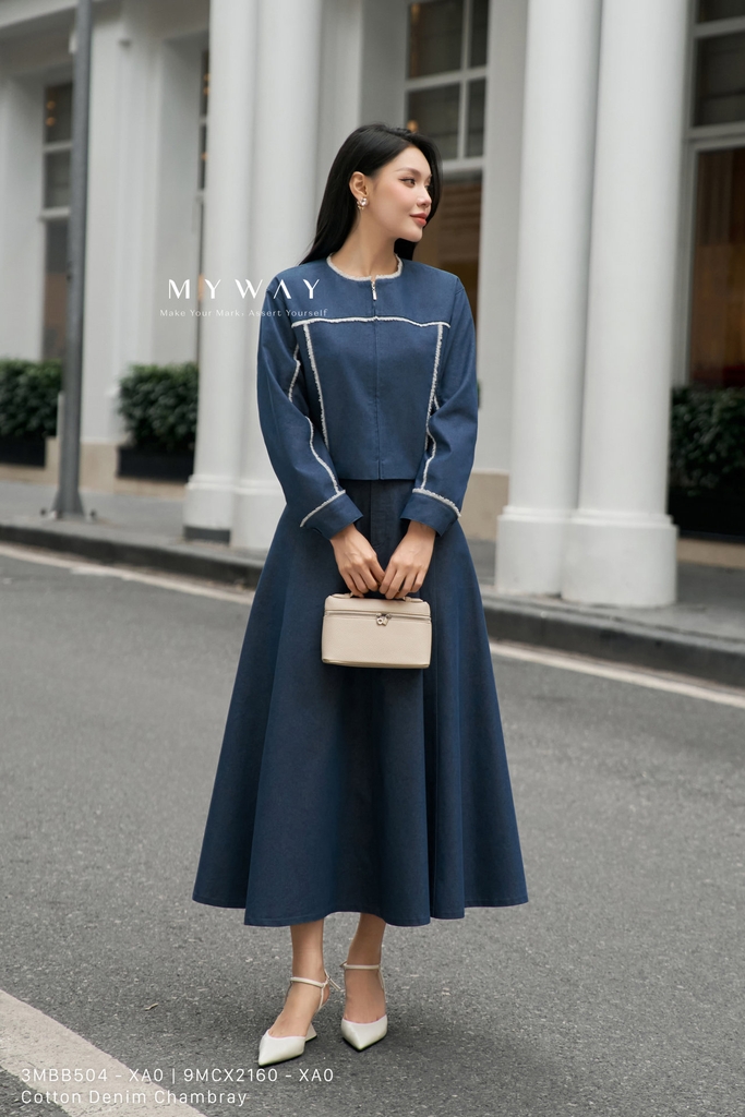 Chân váy xòe dài qua bắp, có khóa trước, túi và lớp lót, nổi bật với các màu xanh than bò, đen và xanh bò sáng, được thiết kế tinh tế với kết cấu vải và đường chỉ chần tạo điểm nhấn. Sản phẩm làm từ chất liệu Cotton Denim Chambray nhập khẩu cao cấp, đã qua xử lý và lên phom chuẩn chỉnh, mang đến dáng váy quyến rũ, hiện đại và dễ mặc. Phom váy xòe giúp che khuyết điểm cơ thể, mang lại sự thoải mái tối đa cho người mặc. Thiết kế toát lên vẻ thanh lịch, phong cách hiện đại và dễ dàng phối hợp với nhiều trang phục khác nhau.