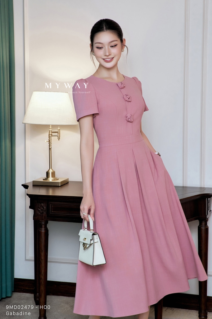 Đầm xòe với phom dáng trên ôm dưới xòe, cổ tròn, tay ngắn, dài qua bắp, có túi và lót, được thiết kế từ chất liệu Gabadine nhập khẩu cao cấp đã qua xử lý, giúp tạo phom dáng chuẩn chỉnh và hiện đại. Nổi bật với họa tiết xước vải tinh tế gam hồng – be và điểm nhấn là ba bông hoa đính khéo léo, chiếc đầm không chỉ giúp che khuyết điểm cơ thể mà còn mang lại vẻ dịu dàng, thanh lịch. Thiết kế mang lại sự thoải mái cho người mặc, phù hợp với phong cách hiện đại và khả năng phối đồ linh hoạt trong nhiều dịp khác nhau.